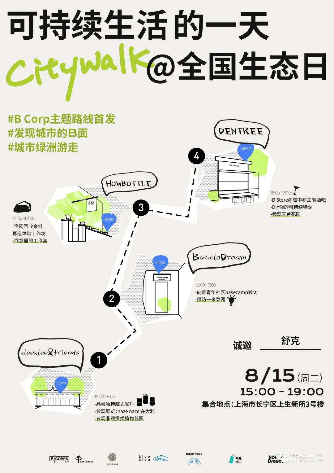 此前 4 月地球月的活动中,B Corps 就联合多方打造了为期 12 天的快闪活动,以可持续接力的方式,让消费者沉浸式体验各种可持续品牌与地球的故事。这次借着时下大热的 City Walk,B Corps 联合可持续品牌以城市游走的方式为参与者打开了观察城市的另一个角度,带领大家体验「可持续发展」的一天,用身体力行的方式感受保护生态的魅力。