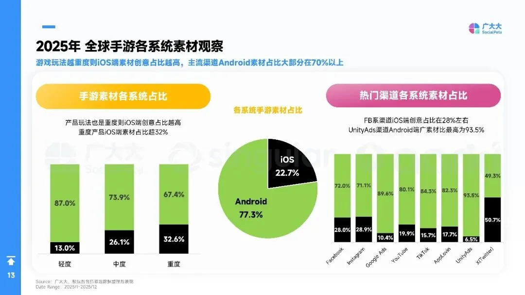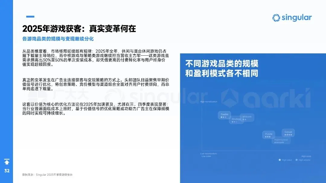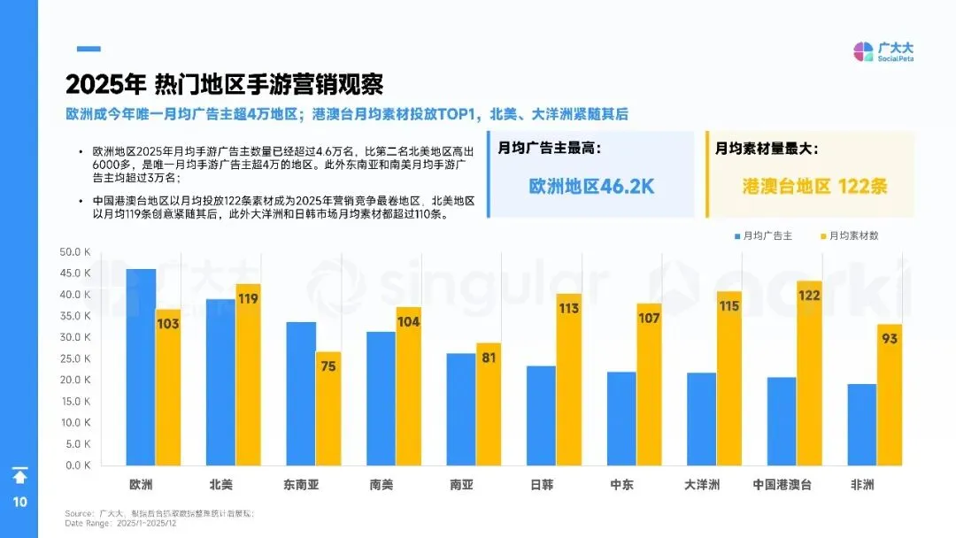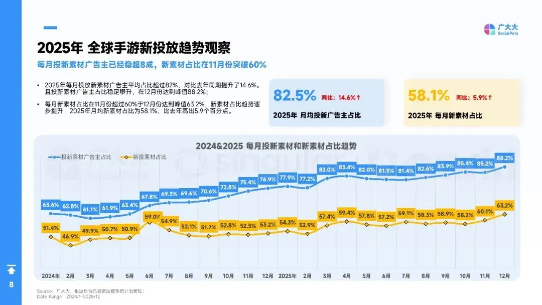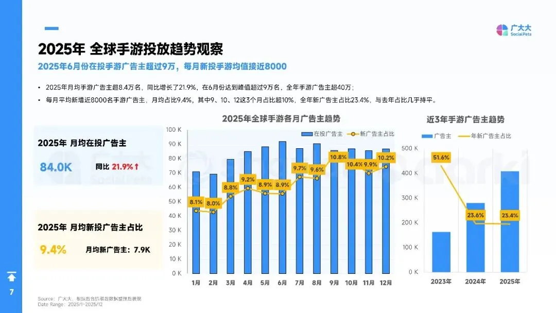 2025年全球手游营销进入“效率优先”时代:广告主总量突破40万,月均新素材占比升至88%,视频创意占74%,短剧化、AI生成与副玩法跑酷成吸量主线。欧洲、港澳台素材最卷,拉美增速最快。品类上,SLG、RPG仍最肯砸钱,休闲益智靠高迭代冲曝光;混合变现(IAA+IAP)全面替代纯内购,4X策略以“联盟加入率”定生死,D7留存≥18%才敢放量。