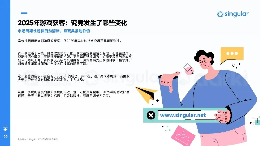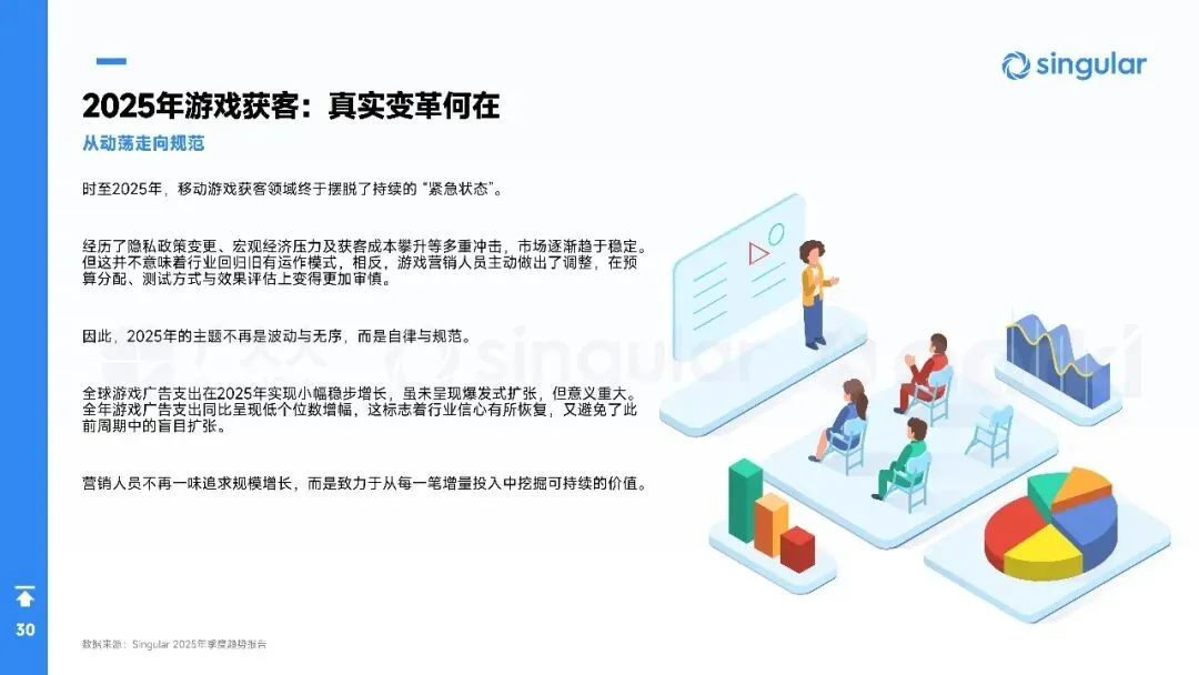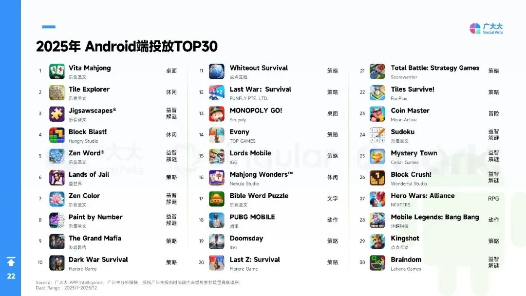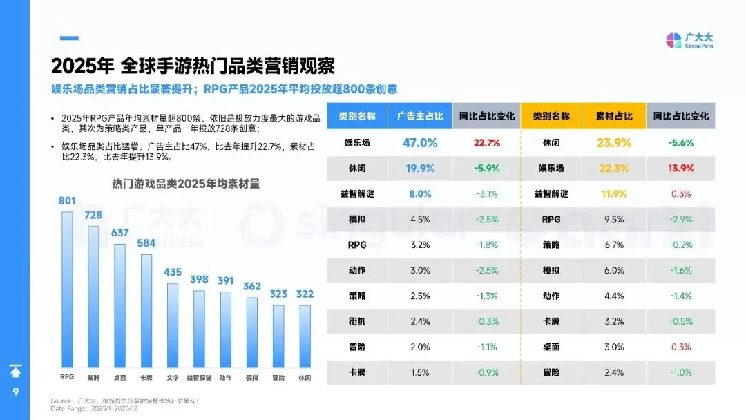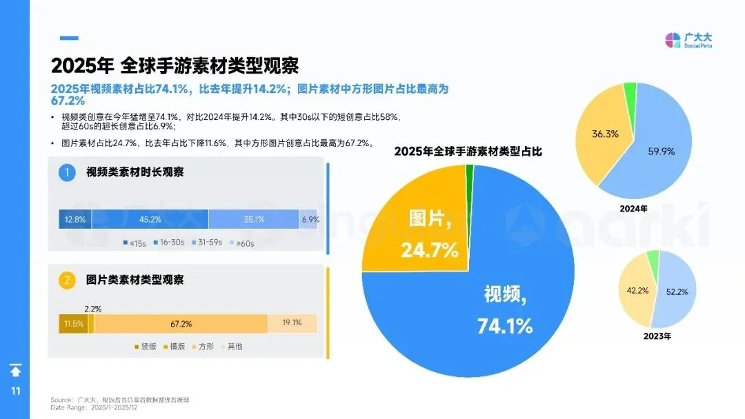 2025年全球手游营销进入“效率优先”时代:广告主总量突破40万,月均新素材占比升至88%,视频创意占74%,短剧化、AI生成与副玩法跑酷成吸量主线。欧洲、港澳台素材最卷,拉美增速最快。品类上,SLG、RPG仍最肯砸钱,休闲益智靠高迭代冲曝光;混合变现(IAA+IAP)全面替代纯内购,4X策略以“联盟加入率”定生死,D7留存≥18%才敢放量。