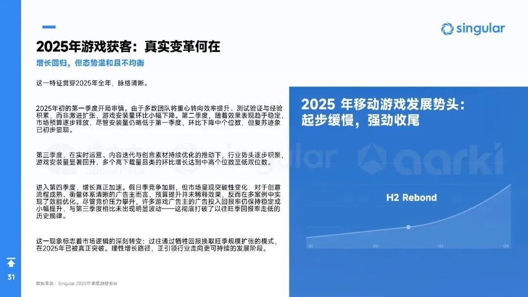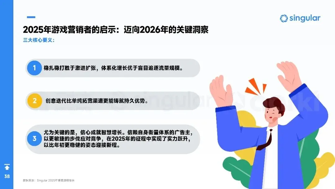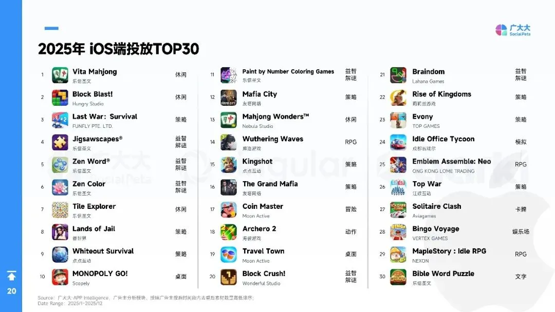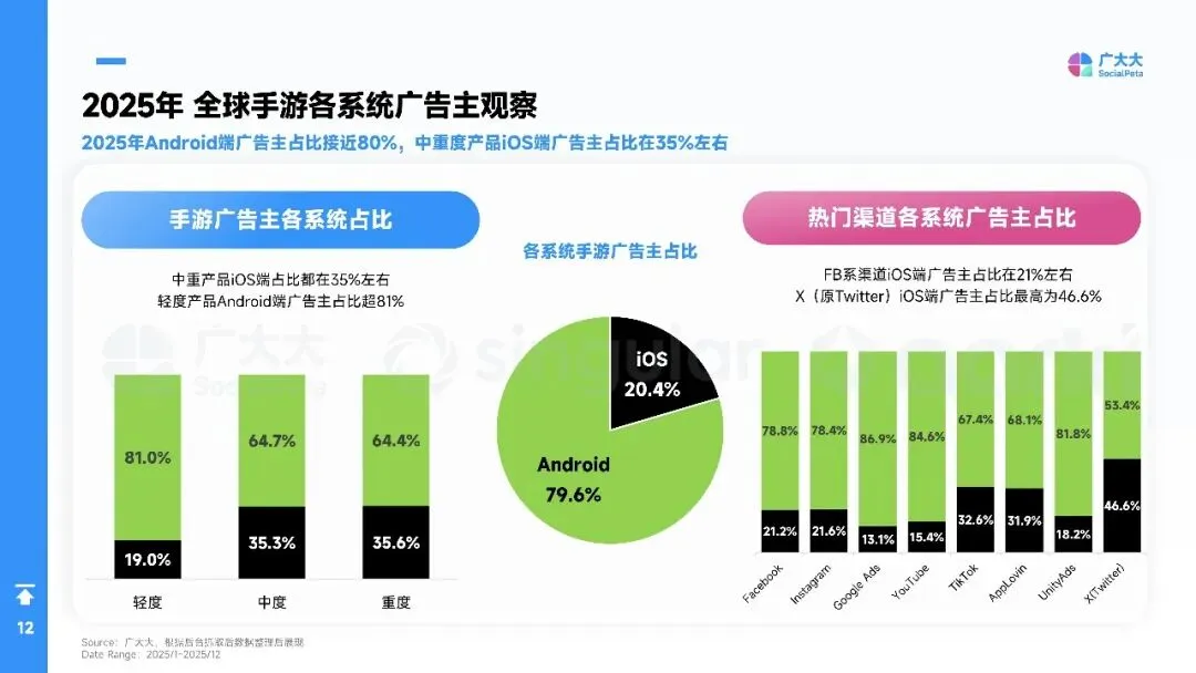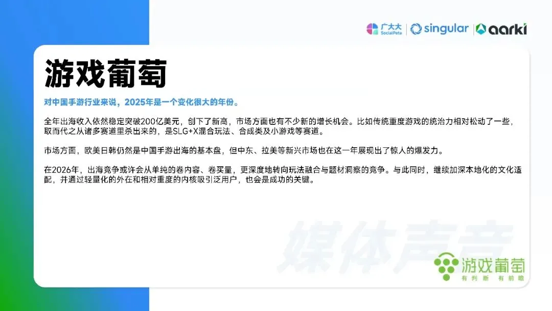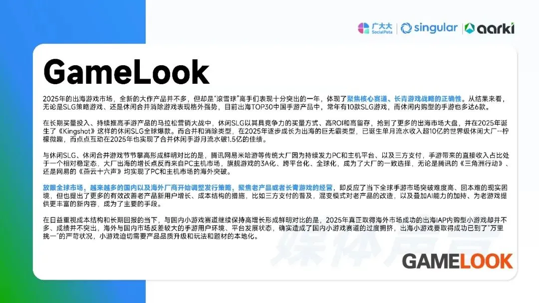 平台侧安卓拉量、iOS提价,Meta系渠道集中度再升,多元化买量成风控刚需。中国出海收入破204亿美元,SLG+合成双引擎,美日韩稳盘,中东拉美接棒;小游戏出海仍“万里挑一”,TikTok平台被寄望成2026新蓝海。核心启示:留存从第0天算起,创意迭代速度决定ROI,AI全链路赋能素材、出价、运营一体化,存量精耕替代粗放买量。