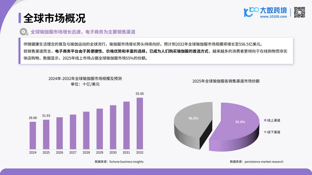 《2026全球瑜伽服市场洞察报告》由大数跨境发布,报告系统分析了在全球健康意识提升与瑜伽运动普及的驱动下,瑜伽服市场正从专业装备扩展为兼具功能、设计与多场景适配的高增长品类,预计2032年市场规模将达556.5亿美元,线上渠道占比过半,并指出品牌需聚焦产品创新、本地化版型、可持续材料及社群文化融入以把握出海机遇。