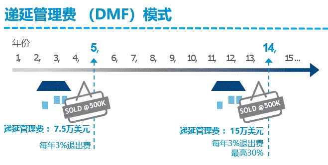 递延管理费(DMF)退休村模式在英国较为常见,在澳大利亚最为盛行。老年人以低于市场费率的价格,购买DMF社区内某一单元的不动产或租赁权益。但是,当要离开社区,或出售单元的权益时,老年人(或其继承人)应按照相应售价的百分比乘以老年人在房产中居住的年份(到达一定的年份后为上限百分比)向退休村开发商支付退出费。
