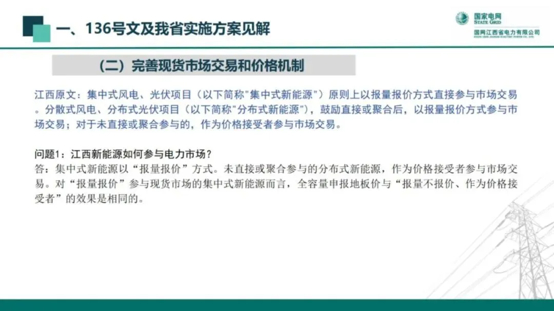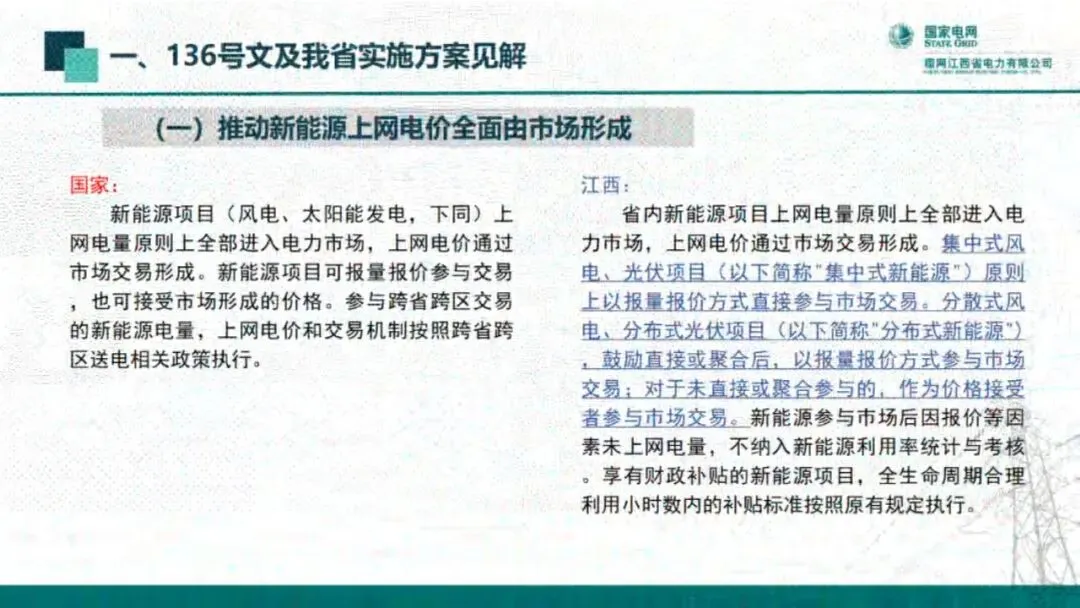 新能源项目(风电、太阳能发电,下同)上网电量原则上全部进入电力市场,上网电价通过市场交易形成。新能源项目可报量报价参与交易,也可接受市场形成的价格。参与跨省跨区交易的新能源电量,上网电价和交易机制按照跨省跨区送电相关政策执行。