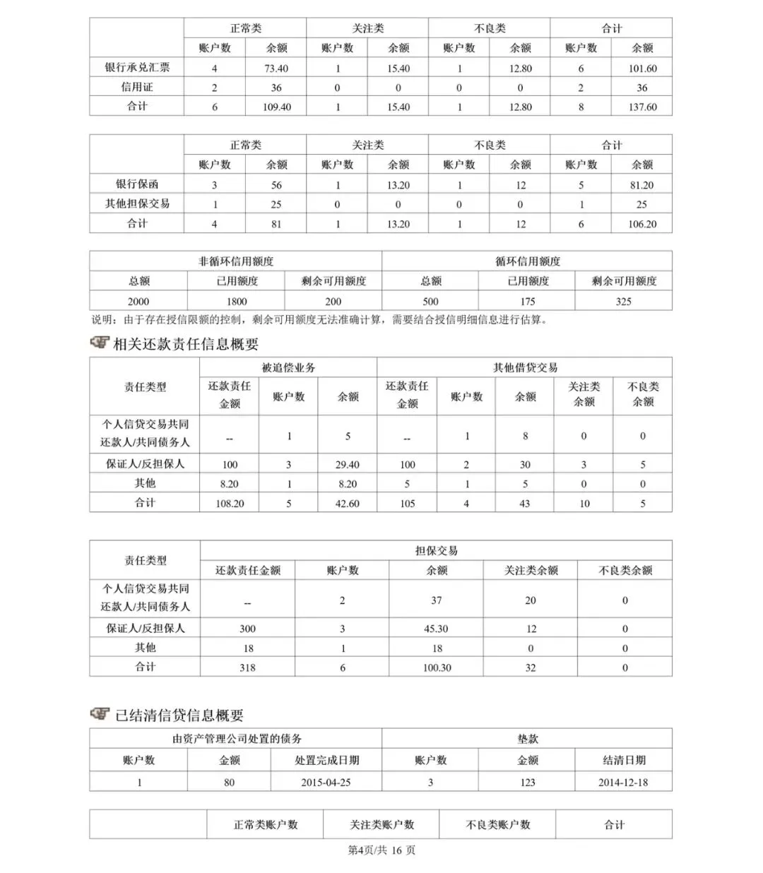 当前未结清信贷交易机构数(正常银行要求在贷机构数不超过5家)注意是看未结清机构数。 借贷/担保总额汇总跟账户数(不可有关注类,不良类余额。) 无欠税-民事判决-强制执行-行政处罚。 非循环跟循环额度(循环指的是可随借随还)