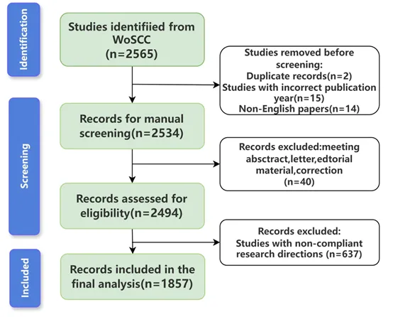 此后,该研究采用 CiteSpace(6.4.R1)和 VOSviewer(1.6.20)对文献进行可视化计量分析,分别用于共被引、突现词及合作网络分析,并结合 R-Bibliometrix 与 R(4.4.3)完成数据处理与弦图展示。