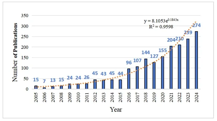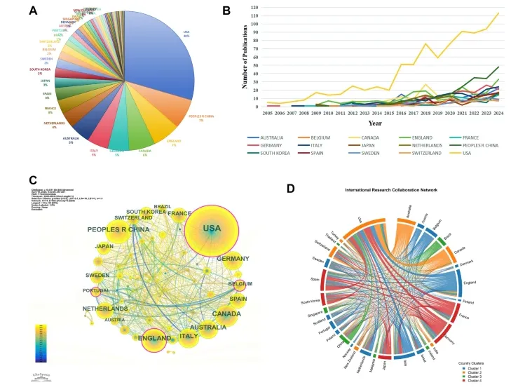 图A展示了该领域在全球范围内的研究贡献及学术影响力分布。美国以30%的发文量位居首位,不仅在数量上占据主导地位,其单篇论文平均被引次数也达到33.18次(表格),显示出显著的学术影响力。中国贡献了约7%的论文数量,体现出较高的研究产出规模,但其平均被引次数为12.56次,提示在即时学术影响力方面仍有提升空间。