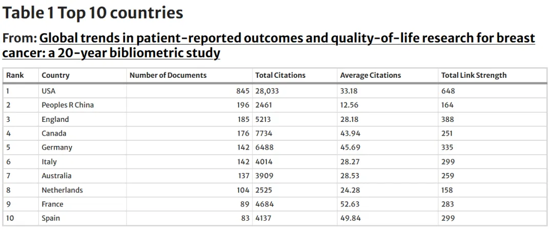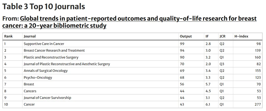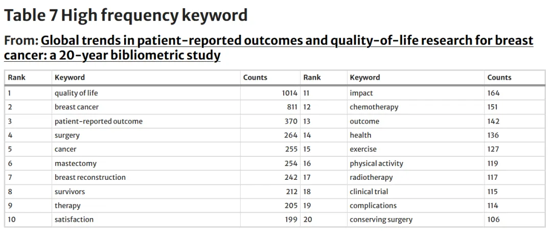 Global trends in patient-reported outcomes and quality-of-life research for breast cancer: a 20-year bibliometric study 一文通过文献计量学方法,系统分析近20年乳腺癌 PROs与生活质量研究的发展趋势,从发文数量、地域分布及研究热点等方面揭示其演变特征,并为优化 PROs 在乳腺癌研究和临床实践中的应用提供参考。