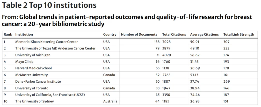 表格显示,美国机构在该研究领域中占据主导地位,发文量排名前十的机构中有8家来自美国。