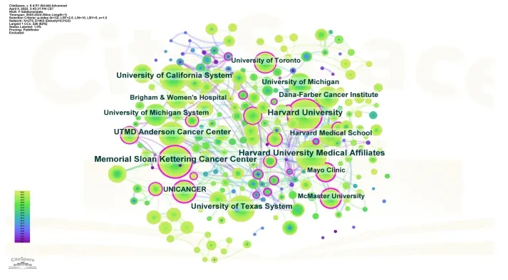 结合“单篇论文平均被引次数”这一指标后,可以更全面地揭示各机构的真实学术影响力。纪念斯隆–凯特琳癌症中心(Memorial Sloan Kettering Cancer Center,美国)以138篇论文位居发文量首位,加州大学旧金山分校(University of California, San Francisco,UCSF)在学术影响力方面表现最为突出,其单篇论文平均被引次数高达74.44次,显著高于其他机构。与此同时,密歇根大学以及加拿大的麦克马斯特大学在保持较高发文量的同时,也展现了较强的单篇影响力。