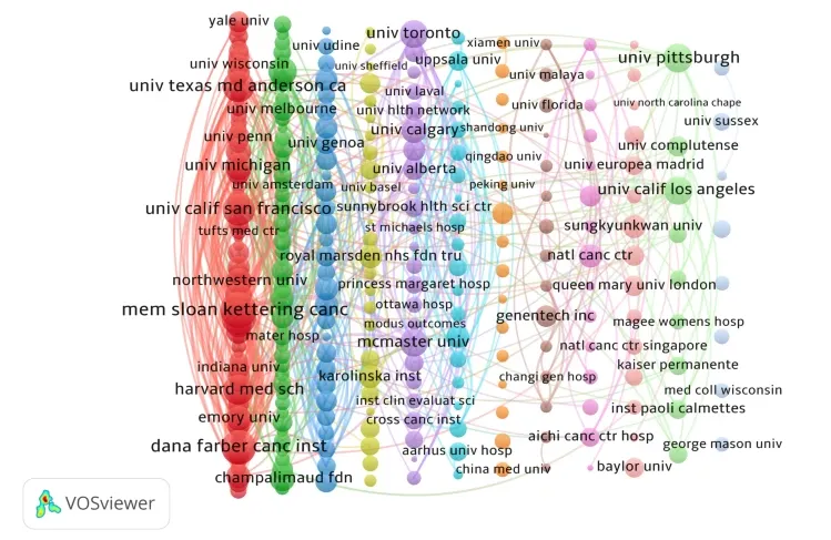 机构合作共现网络图显示:达纳-法伯癌症研究所(Dana-Farber Cancer Institute)以0.30的中介中心性位居首位,明显高于其他机构,显示其在连接不同研究集群、整合全球合作网络方面处于核心枢纽地位。相比之下,部分哈佛大学附属机构、UNICANCER 以及悉尼大学的中心性较低(0.07–0.09),提示这些机构更多集中于各自内部或局部合作网络,跨集群联系相对有限。