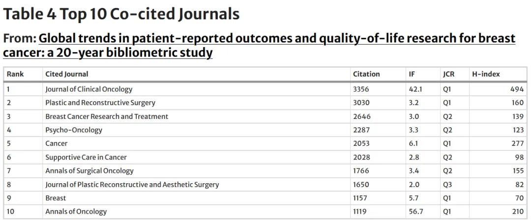 《Journal of Clinical Oncology》以3356次共被引位居首位,其次为《Plastic and Reconstructive Surgery》(3030次)和《Breast Cancer Research and Treatment》(2646次)。在影响因子方面,《Annals of Oncology》最高(IF=56.7),而《Journal of Clinical Oncology》则拥有最高的H指数(494)。
