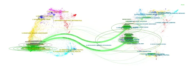 学术文献的主题分布则通过双图谱叠加进行展示。图中彩色路径表示引文关系,左侧为施引期刊,右侧为被引期刊。图8显示了一条主要的引文路径,大多数研究论文集中于“分子生物学、免疫学与临床医学”领域,而被引文献主要来源于“分子生物学与免疫学”以及“医学与临床医学”相关学科。这表明该研究领域在基础生物医学研究与临床应用之间形成了紧密而稳定的知识传递通道。