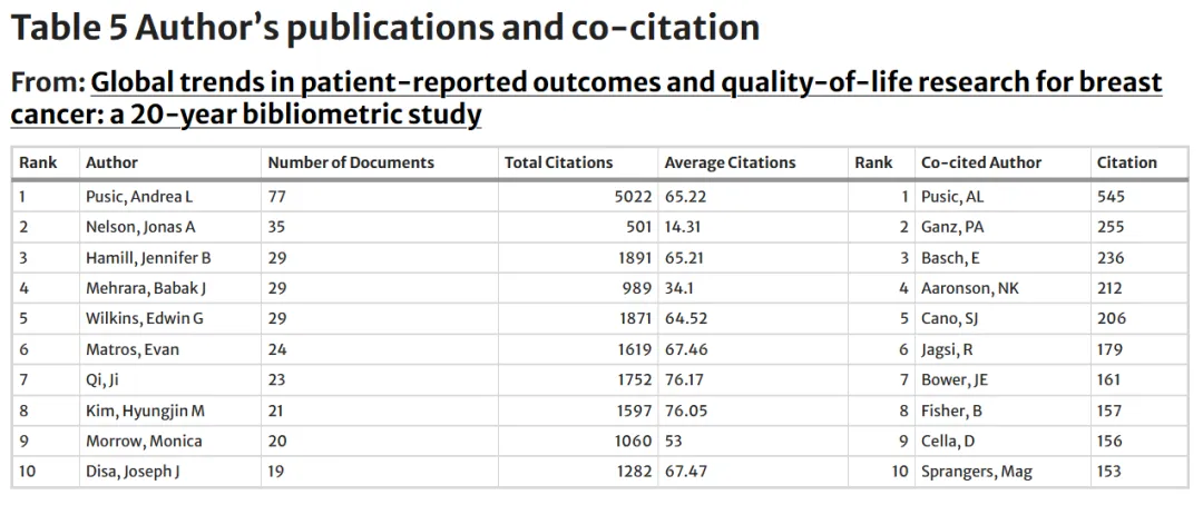 Andrea L. Pusic 在发文量(n=77)和总被引次数(5,022次)方面均位居首位,显示出其在该领域中的高产性和广泛影响力。结合“单篇论文平均被引次数”这一指标后,可以更细致地反映作者的学术影响力。一些发文量相对较少的作者,如 Ji Qi(23篇论文)和Hyungjin M. Kim(21篇论文),却表现出极高的研究影响力,其单篇平均被引次数分别达到 76.17 次和 76.05 次。该结果表明,作者的发文总量并不一定直接等同于其研究工作的平均学术影响力。