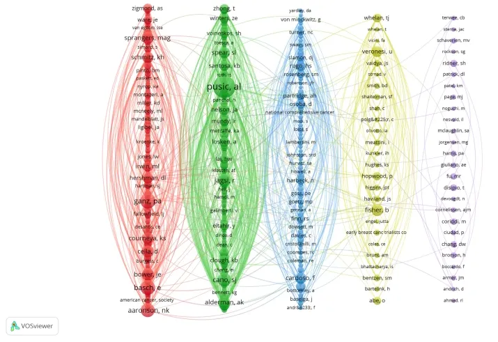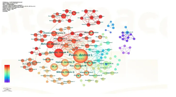该图直观地展示了作者间的协作关系。下图生成的作者共被引网络,共有 254 位作者的被引次数超过 30 次,反映了其在该研究领域中的较高学术声誉和影响力。其中,共被引频次最高的作者包括A. L. Pusic(n=545)、P. A. Ganz(n=255)和 E. Basch(n=236),其节点规模最大,表明其研究成果在该领域中被广泛引用并具有核心地位。