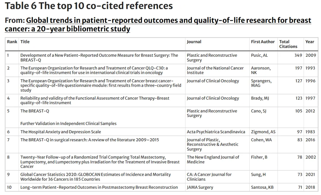 该文对共被引文献进行了聚类分析和时间序列聚类分析,结果如图所示。研究发现,在早期阶段,“患者报告结局量表”(patient-reported outcome measure,聚类10)和“体重管理”(weight management,聚类6)是该领域的核心研究主题。中期研究则主要集中于乳腺重建(聚类1)、乳腺癌幸存者(聚类7)以及激素受体阳性乳腺癌(聚类9)。近年来,研究热点逐渐转向患者报告结局(patient-reported outcome,聚类0)、乳腺癌(聚类3)以及心理测量学验证(psychometric validation,聚类8),反映出该领域研究重点由工具开发向应用拓展及量表科学性验证的演进趋势。