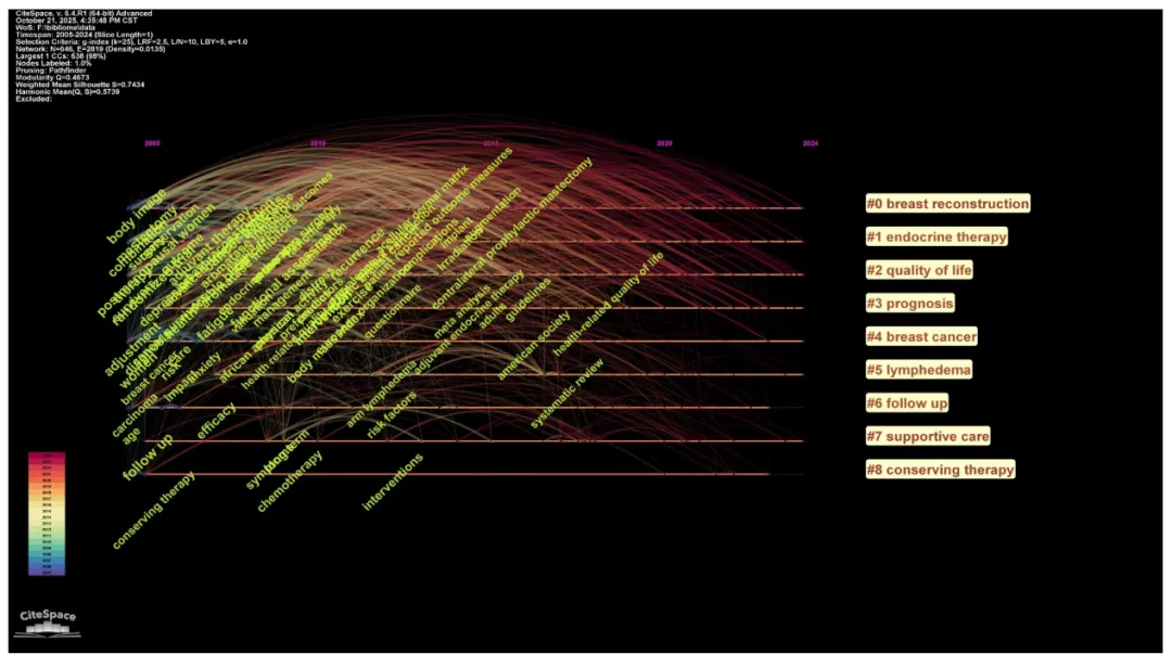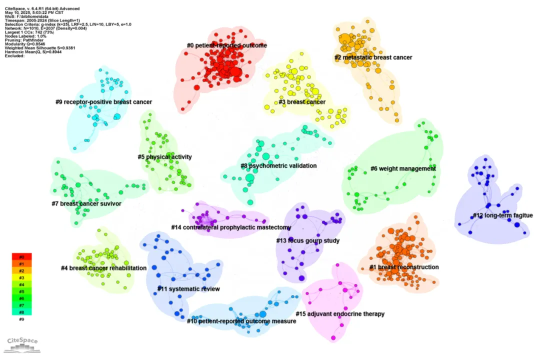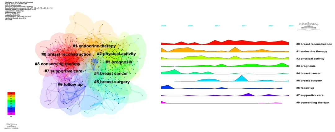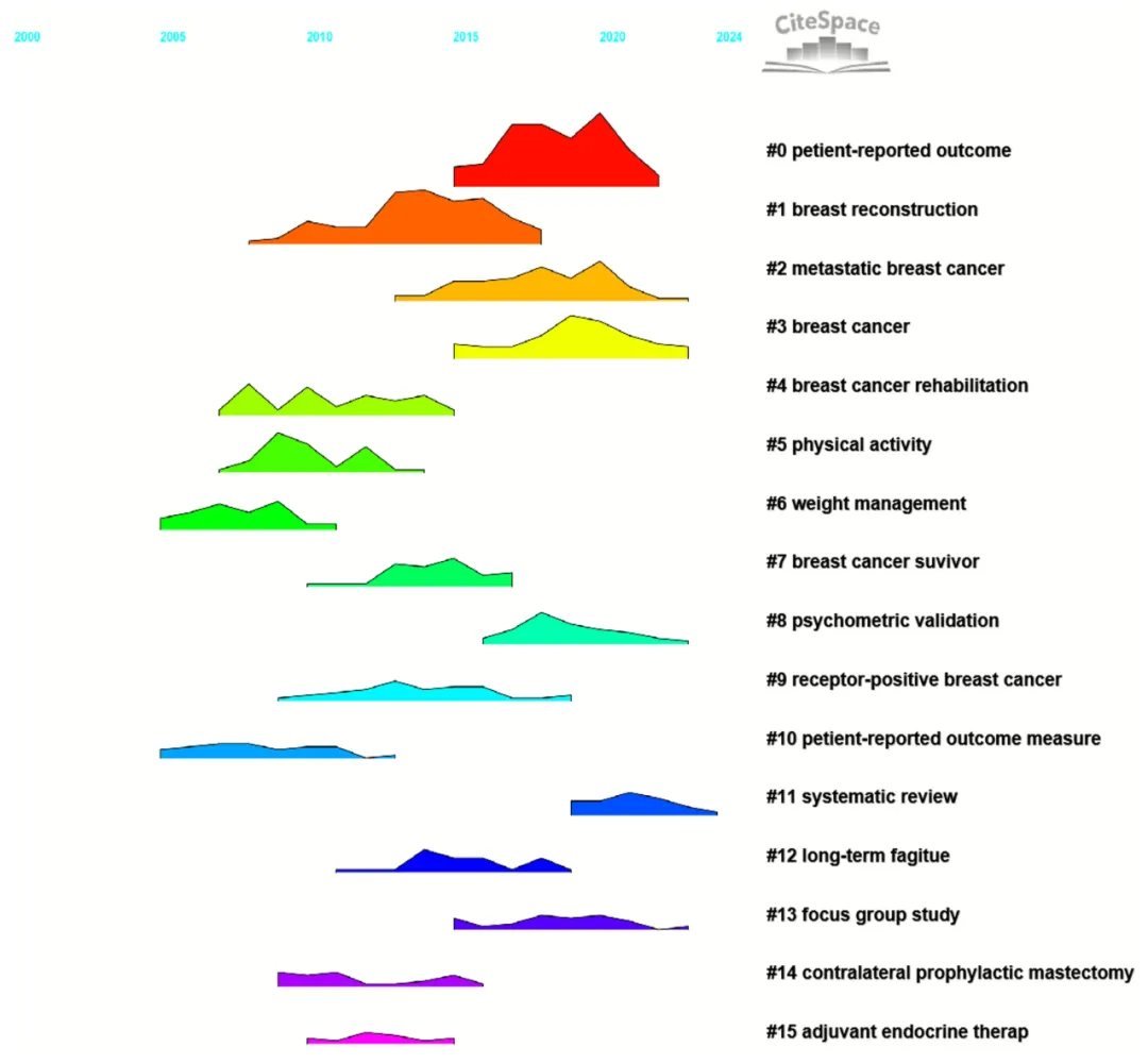CiteSpace 聚类图谱更直观展示了研究热点的演变过程,结果显示乳房重建、内分泌治疗、预后以及体力活动已成为当前该领域的核心研究方向。