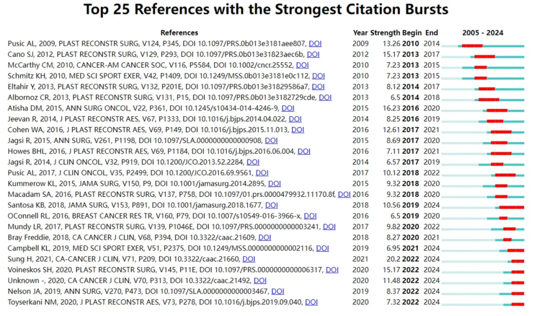 此外,在乳腺癌患者报告(PROs)和生活质量(QoL)研究领域中具有显著突现性的高被引文献,反映了不同时期学术影响力的集中爆发。如下图所示,这些文献突现结果清晰地揭示了过去20年中该领域研究重点逐步向以患者为中心的结局评价及创新研究方法转变的趋势。