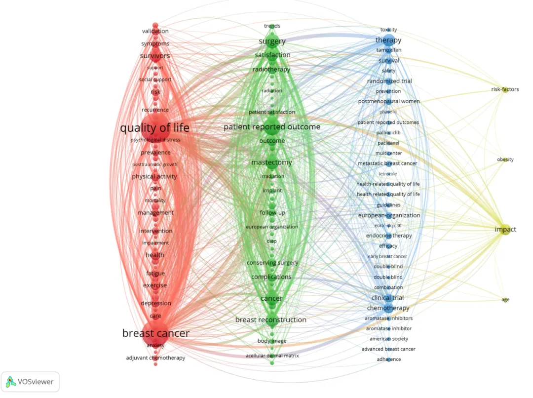 时间线与关键词分析清晰勾勒了该研究领域的演进脉络及其临床背景。研究最初经历了基础阶段(2005–2012年),主要聚焦于患者报告结局(PRO)量表工具的开发与验证;随后进入以干预为核心的阶段(2013–2019年),研究重点转向乳房重建、肿瘤幸存者管理以及运动等相关主题;而在当前阶段(2020–2024年),研究进一步迈入以患者为中心的发展时期,显著关注心理健康问题及更加精细化的外科治疗技术。