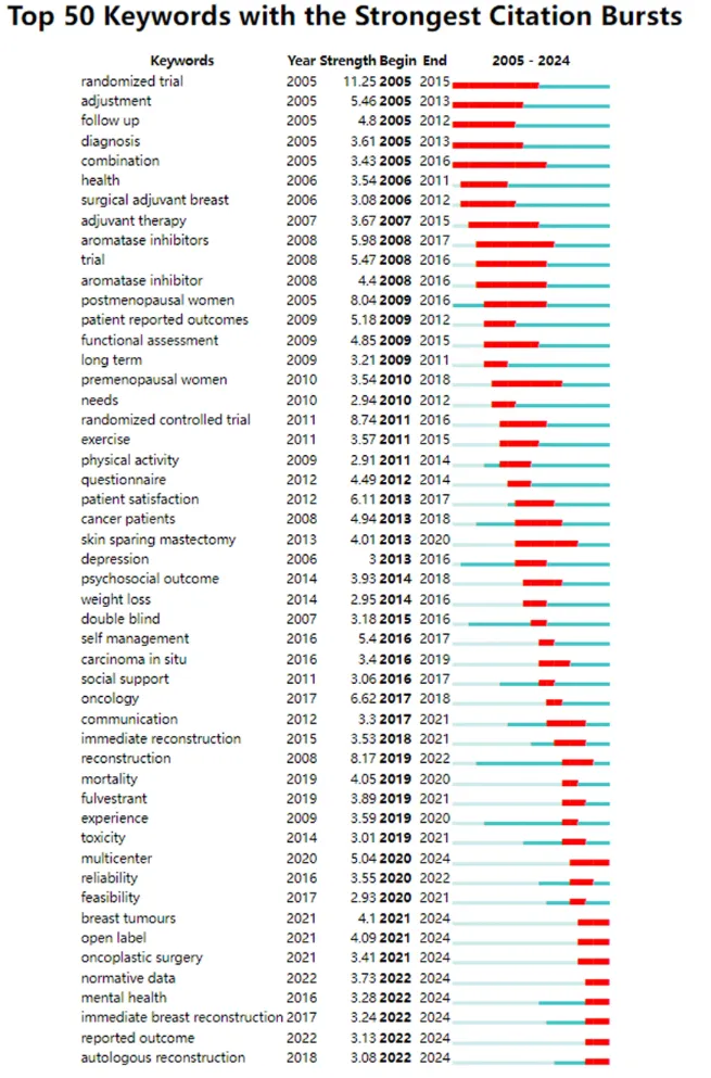 此外,该文分析了突现强度最高的50个关键词,以揭示乳腺癌患者报告结局(PRO)和生活质量(QoL)研究中的当前重点与新兴趋势。由关键词突现的整体来看,该领域的研究格局正在传统疗效评价与整体化、患者导向的护理模式之间取得新的平衡。