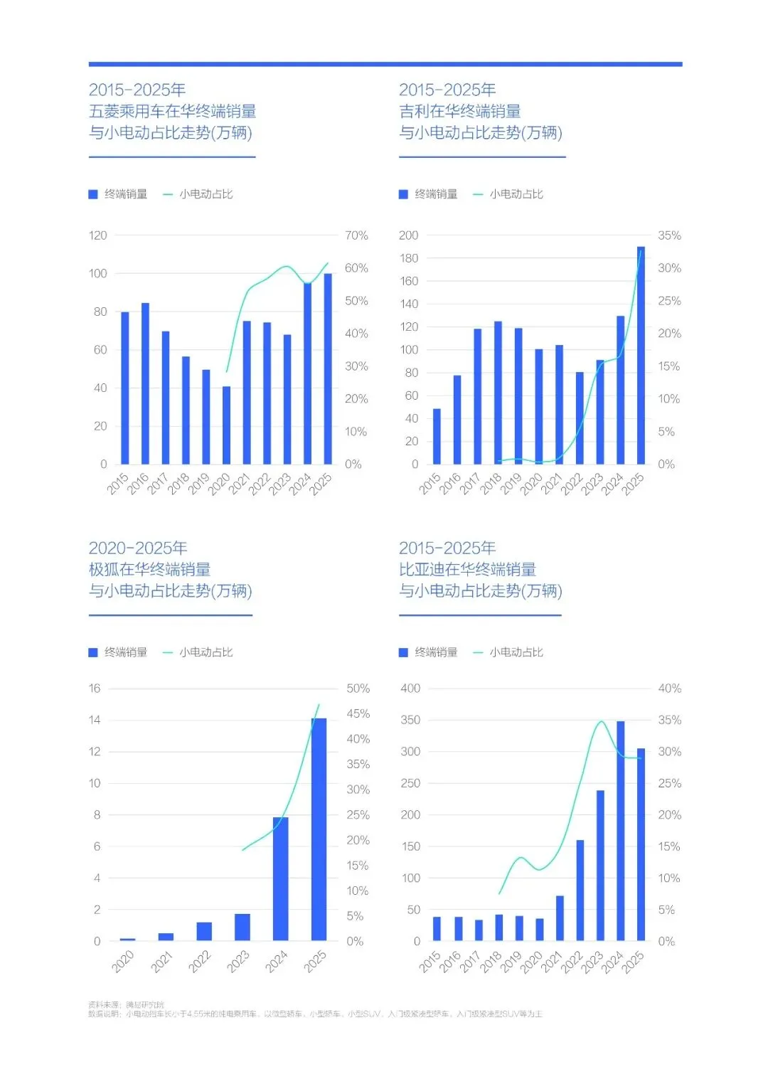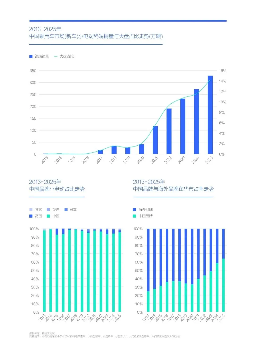 2020年起,随着宏光MINIEV、好猫、海豚、海鸥、缤果、星愿等诸多小电动的蜂拥而至与快速爆款(小电动指车长小于4.55米的纯电乘用车),中国车市的小电动销量,从2020年的不足50万辆,飙升至2025年的300多万辆,一路高歌猛进,实现惊人的六倍多增长。期间小电动占中国乘用车(新车)的销量比例,由不足3%飙升至14%多,由边缘性产品摇身一变为主流产品;