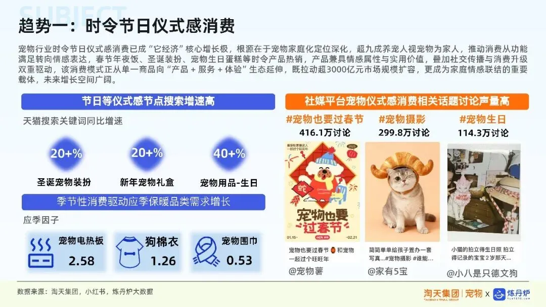 情感陪伴升级宠物日益被视为家庭成员,消费从功能满足转向情感表达。时令节日仪式感消费成为增长引擎,宠物蛋糕、节日装扮、生日摄影等兼具情感与实用价值的产品备受青睐,消费模式向“产品+服务+体验”生态延伸。