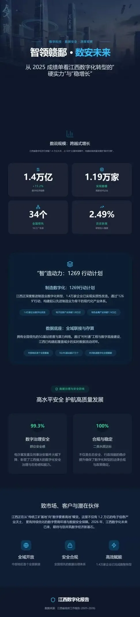 细数今年的报告,“数字经济”、“数据要素”、“统筹安全与发展”、“人才强省”等高频热词,为我们清晰地勾勒出一幅“数字江西”的宏伟蓝图。