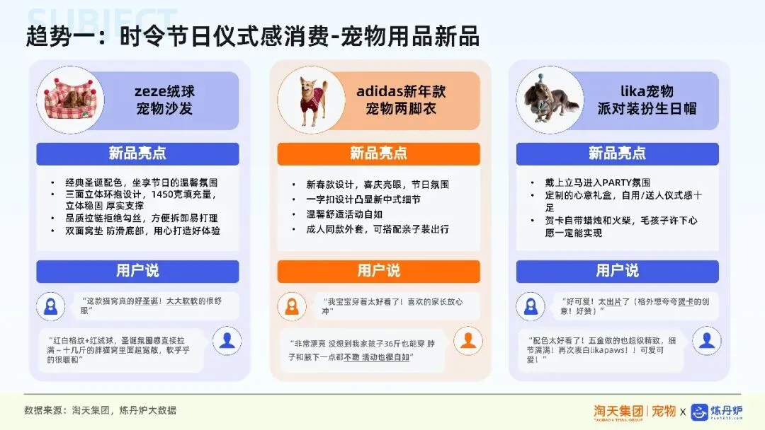 1. 情感陪伴升级宠物日益被视为家庭成员,消费从功能满足转向情感表达。时令节日仪式感消费成为增长引擎,宠物蛋糕、节日装扮、生日摄影等兼具情感与实用价值的产品备受青睐,消费模式向“产品+服务+体验”生态延伸。