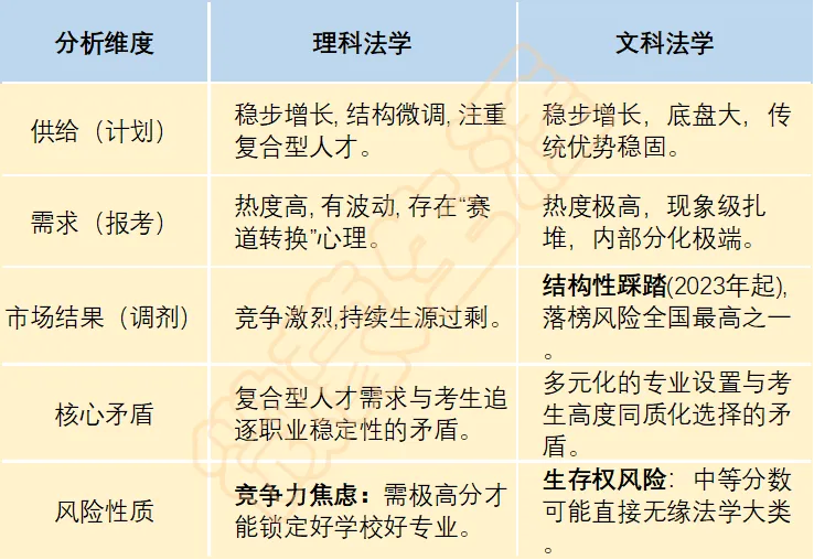 主导力量是“需求端过热”:当前的失衡主要不是高校供给不足(计划在增),而是考生需求(报考意愿)过于旺盛且集中。这是社会观念(法律职业光环)、就业预期(稳定性)与考生规避纯工科内卷心态共同作用的结果,短期内难以根本逆转。