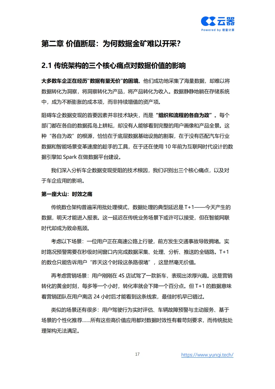白皮书指出,汽车产业正经历从“马力”到“算力”、从“硬件定义”到“数据与AI定义”的深刻范式转移。然而,大多数车企受困于传统批处理架构的“时效之痛”、烟囱式系统的“孤岛之痛”以及EB级数据量的“成本之痛”,导致数据“有量无价”,难以转化为业务增长动力。