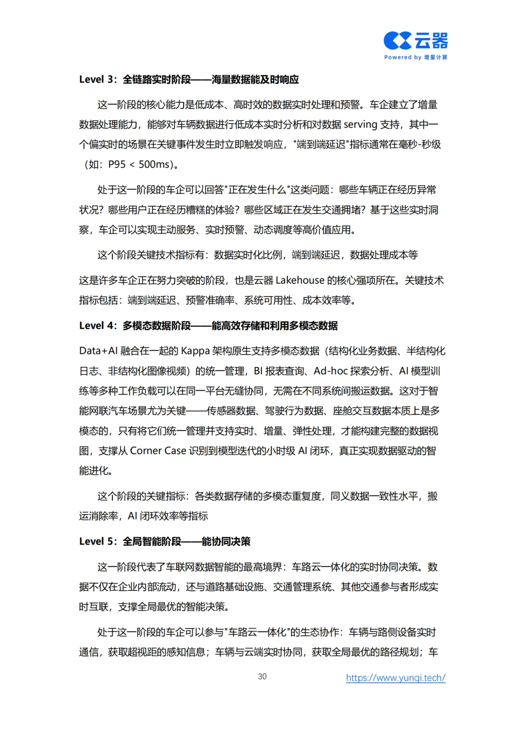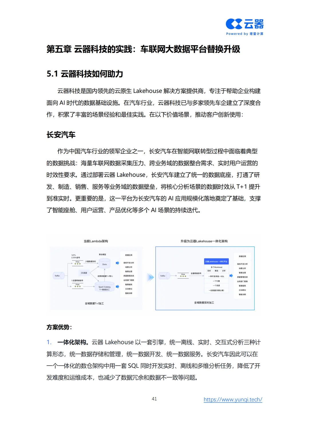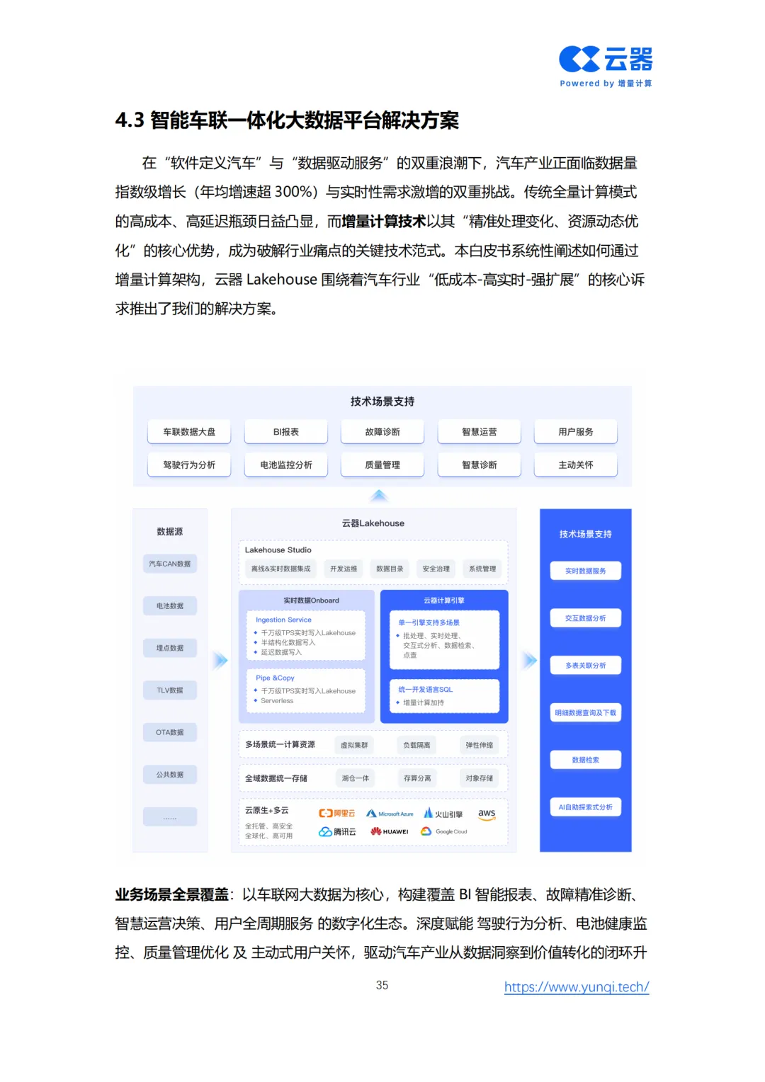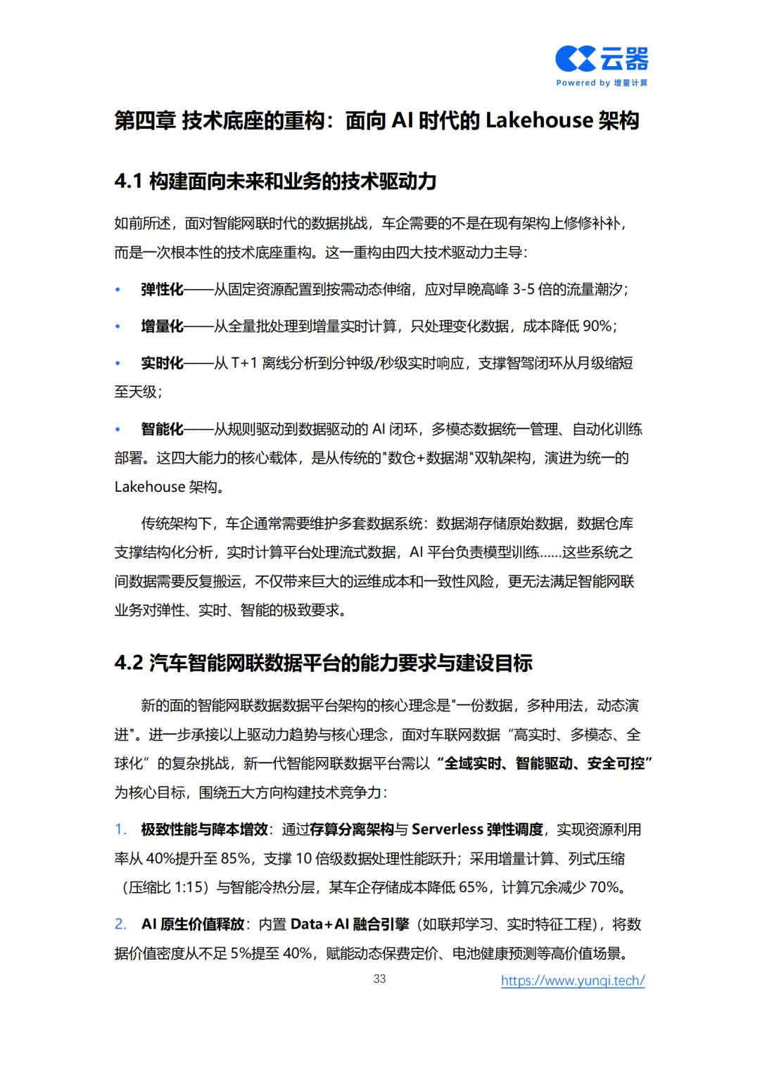 为此,白皮书创新性地提出了 “智能网联数据智能成熟度模型” ,为车企从Level 1(数据采集)到Level 5(全局智能协同)的进阶提供了清晰的路线图。核心解决方案在于重构技术底座,转向面向AI时代的 云原生Lakehouse架构。该架构通过存算分离、增量计算、流批一体和AI原生四大核心能力,实现全域数据实时化、多模态融合与成本线性可控,赋能从情感智能座舱、分钟级智驾数据闭环到VLM端到端驾驶等五大新增AI应用场景。