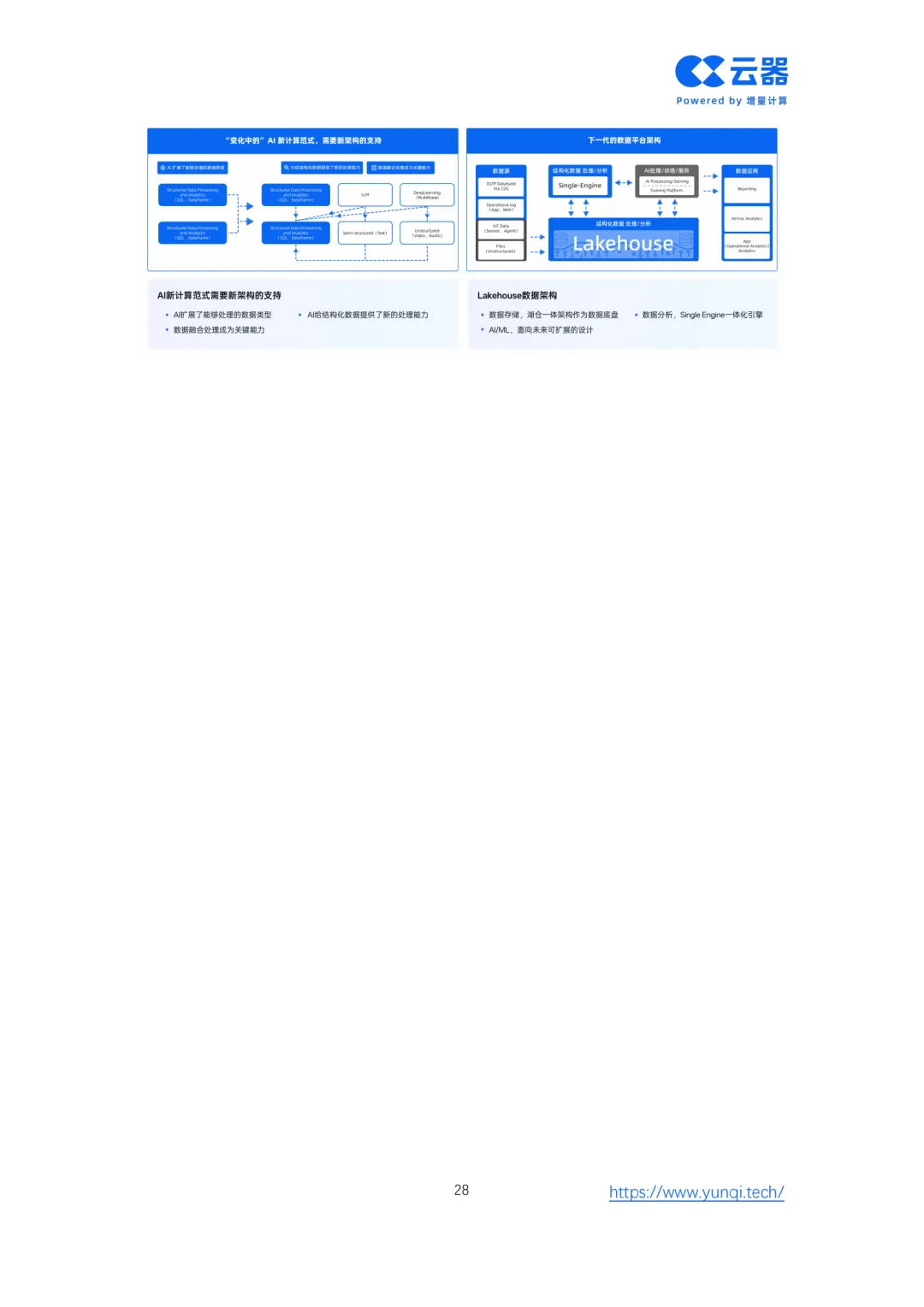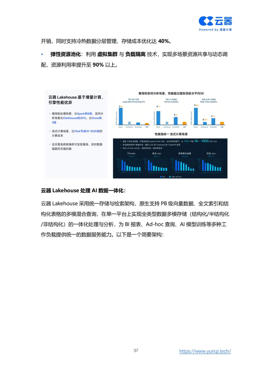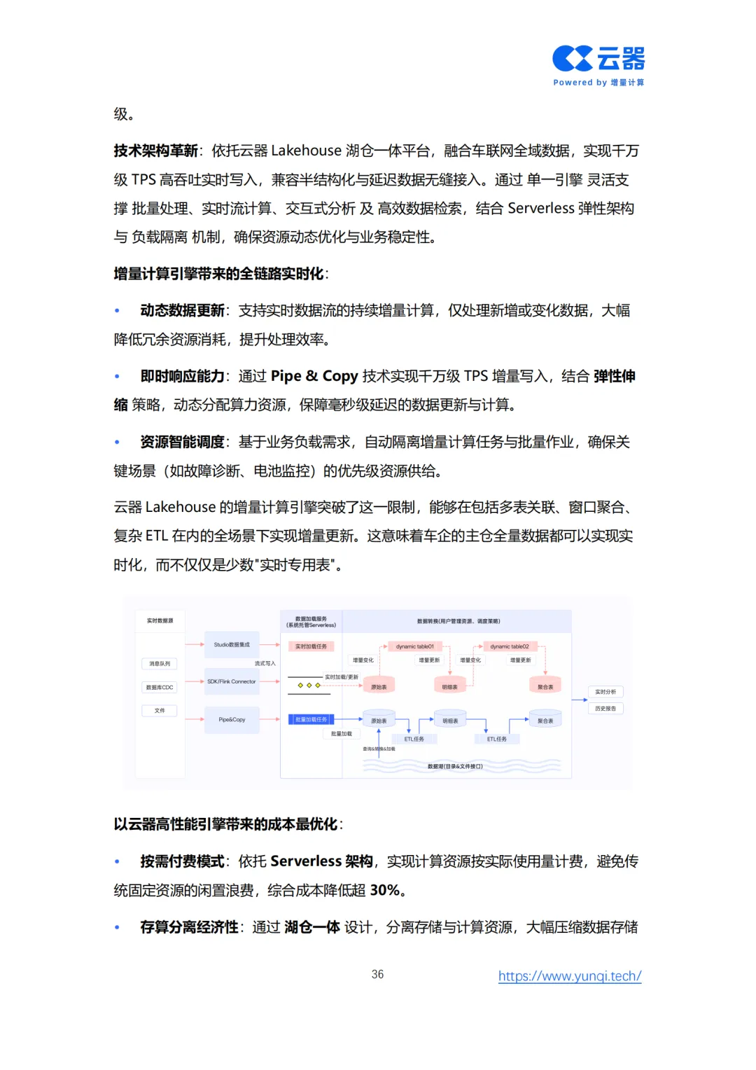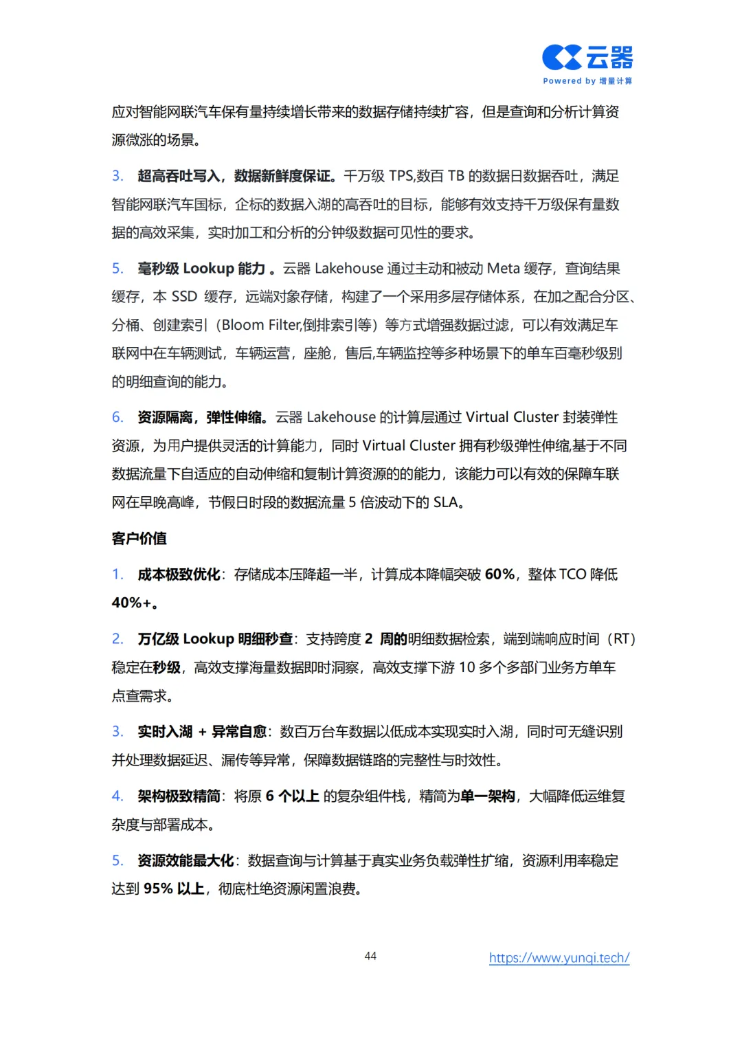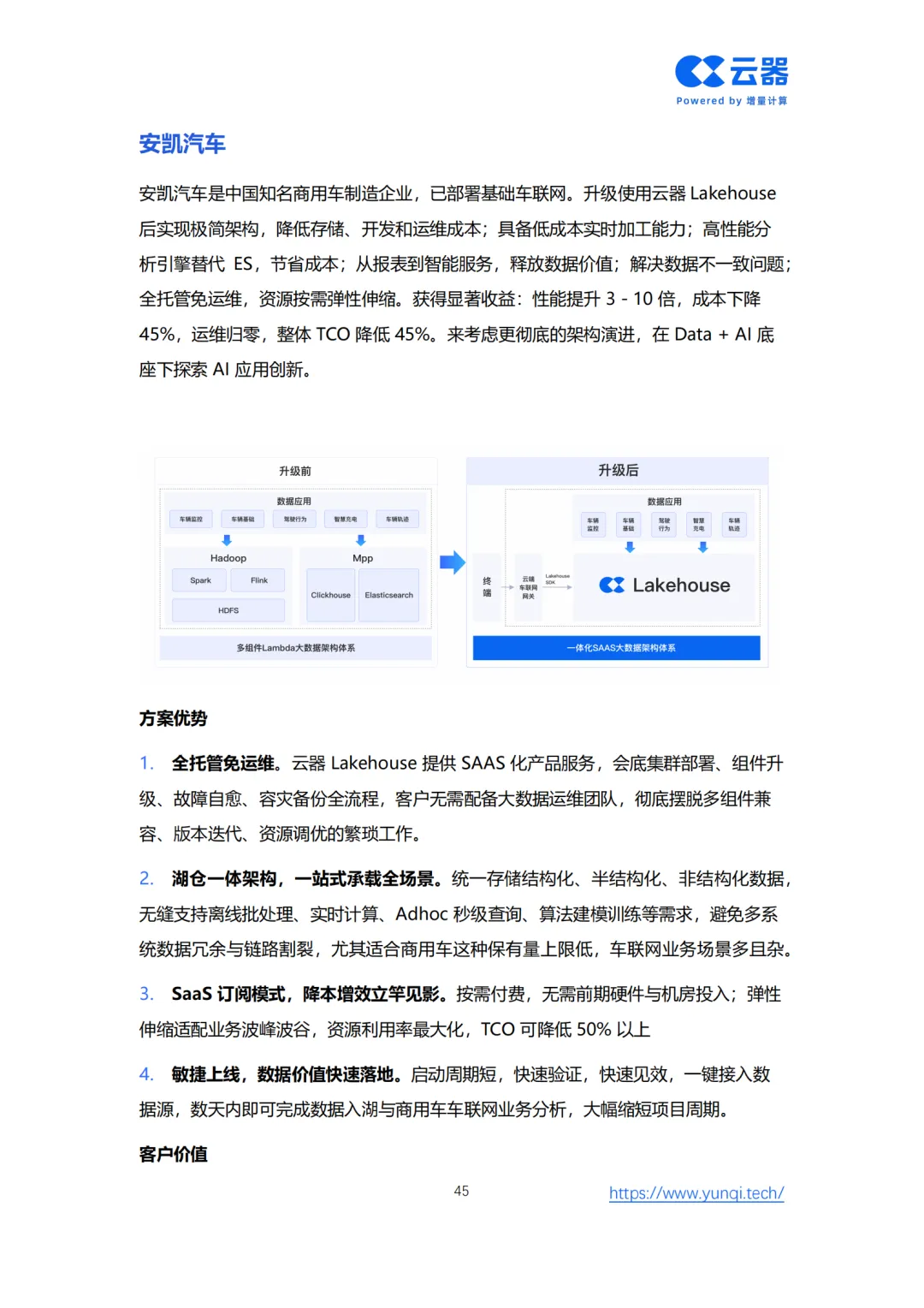 为此,白皮书创新性地提出了 “智能网联数据智能成熟度模型” ,为车企从Level 1(数据采集)到Level 5(全局智能协同)的进阶提供了清晰的路线图。核心解决方案在于重构技术底座,转向面向AI时代的 云原生Lakehouse架构。该架构通过存算分离、增量计算、流批一体和AI原生四大核心能力,实现全域数据实时化、多模态融合与成本线性可控,赋能从情感智能座舱、分钟级智驾数据闭环到VLM端到端驾驶等五大新增AI应用场景。
