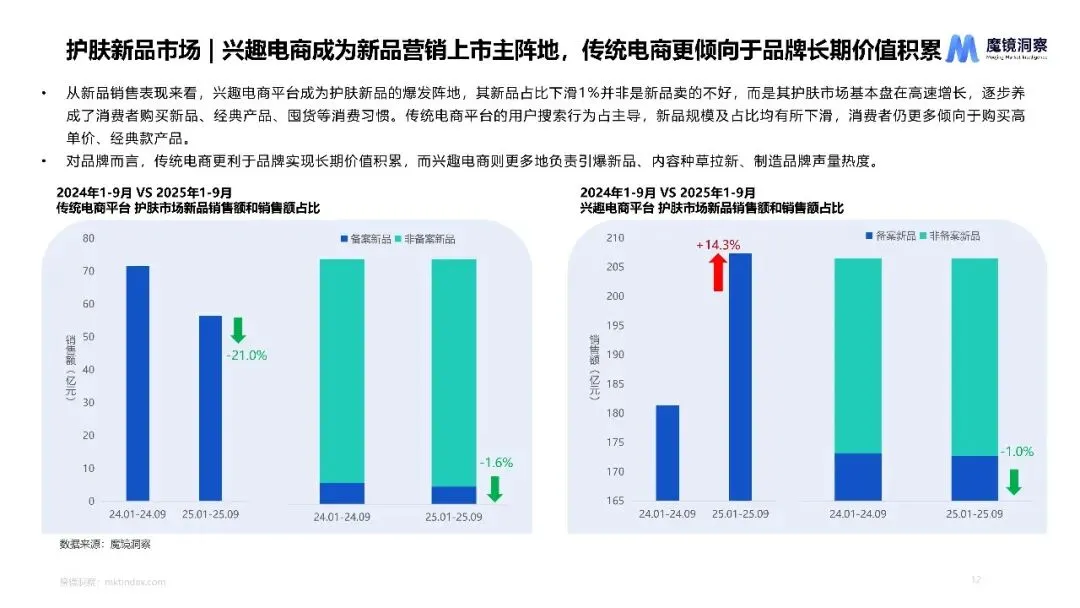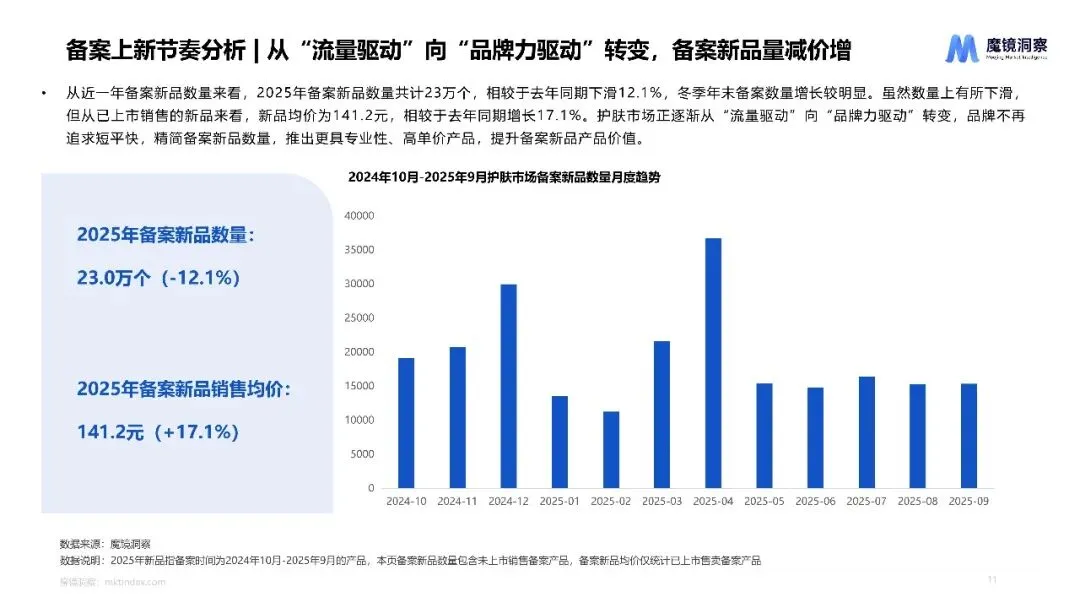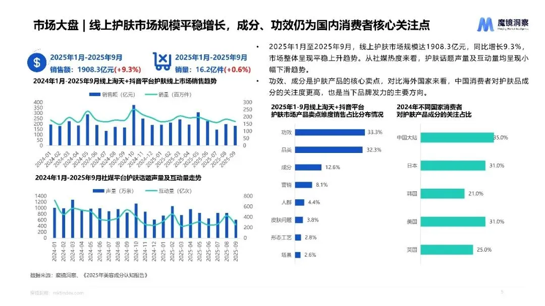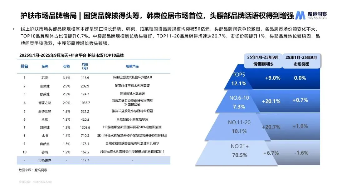 2025年线上护肤市场销售额1908亿元,同比增9.3%,国货韩束、珀莱雅领跑,抖音成新品爆发地。备案新品数量下滑12%,均价升17%至141元,品牌转攻“少而精”高价值单品。