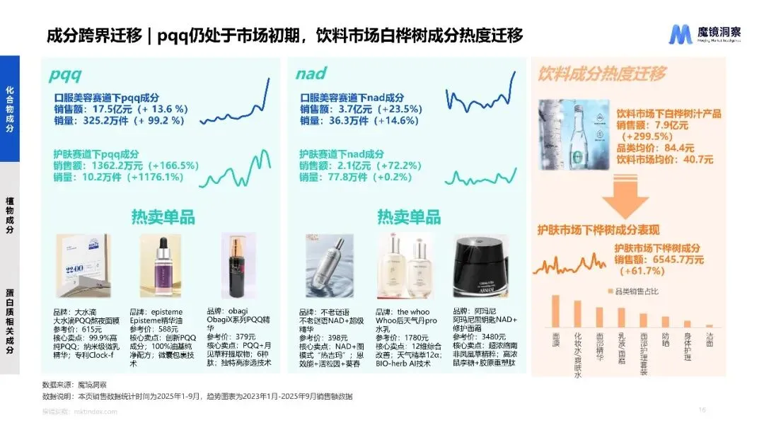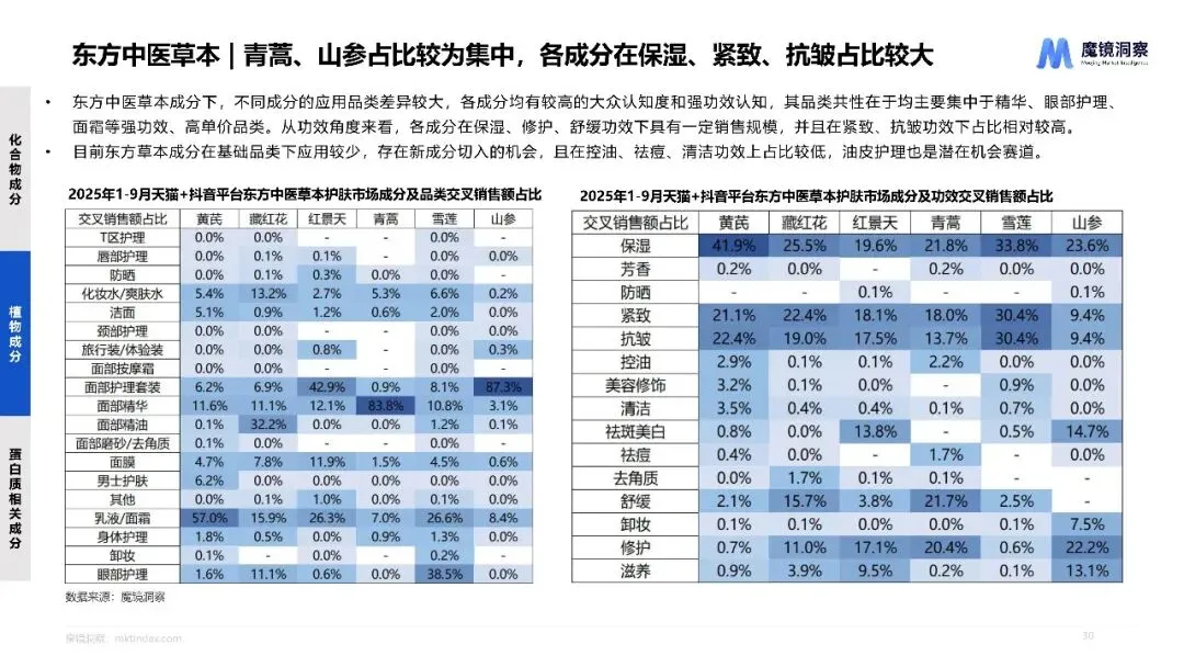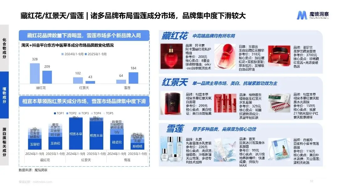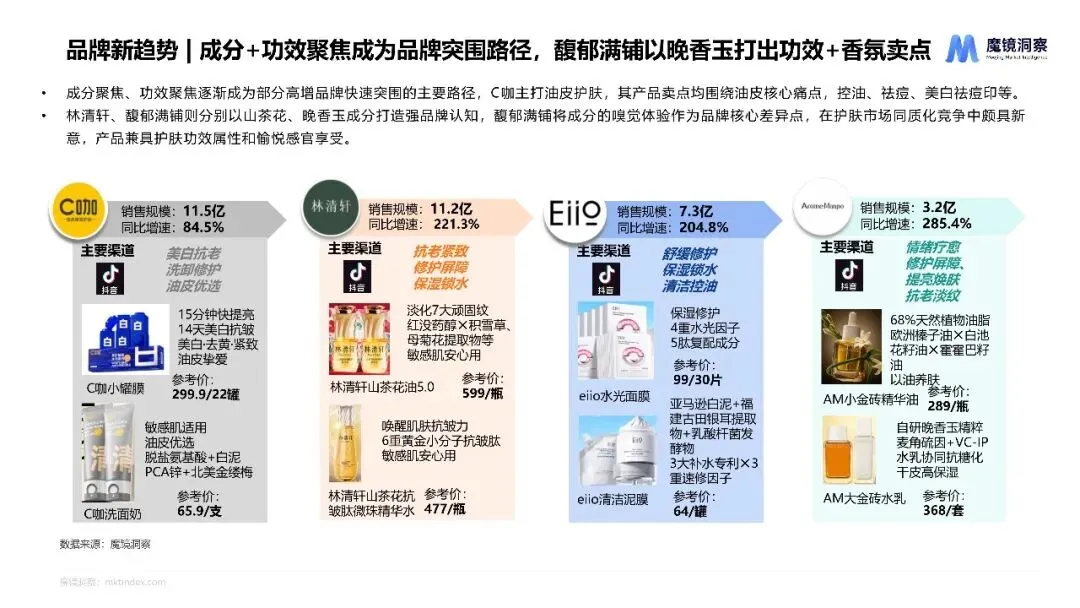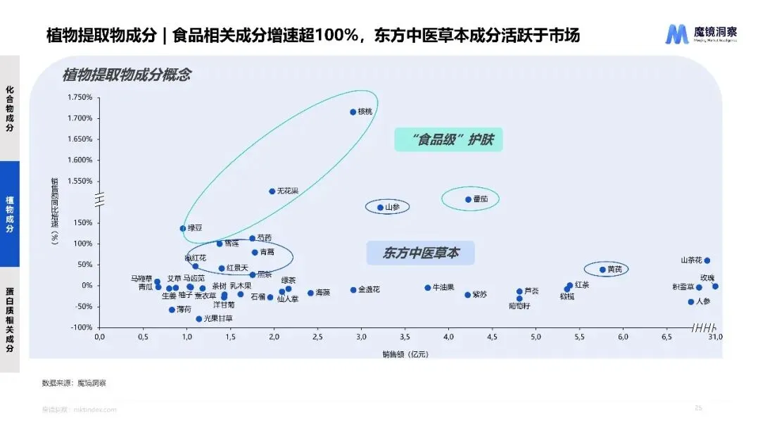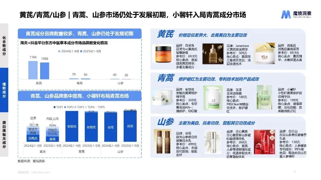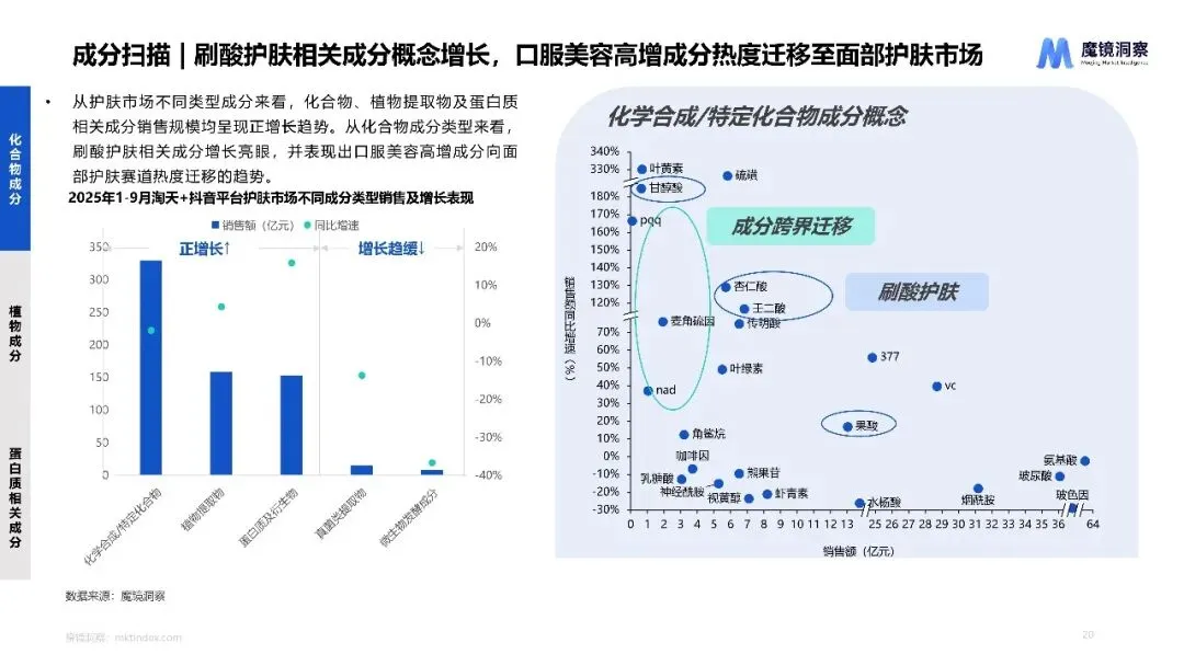 舒缓、修护、抗衰功效翻倍增长,美白门槛提高。刷酸日常化、身体刷酸冒头;口服美容成分麦角硫因、PQQ外迁护肤,食品级“核桃、绿豆”凭安全感走红,东方草本青蒿、山参切入高端修护。精华、面霜成国产高端化主战场,自研环六肽、重组胶原撑起技术故事。