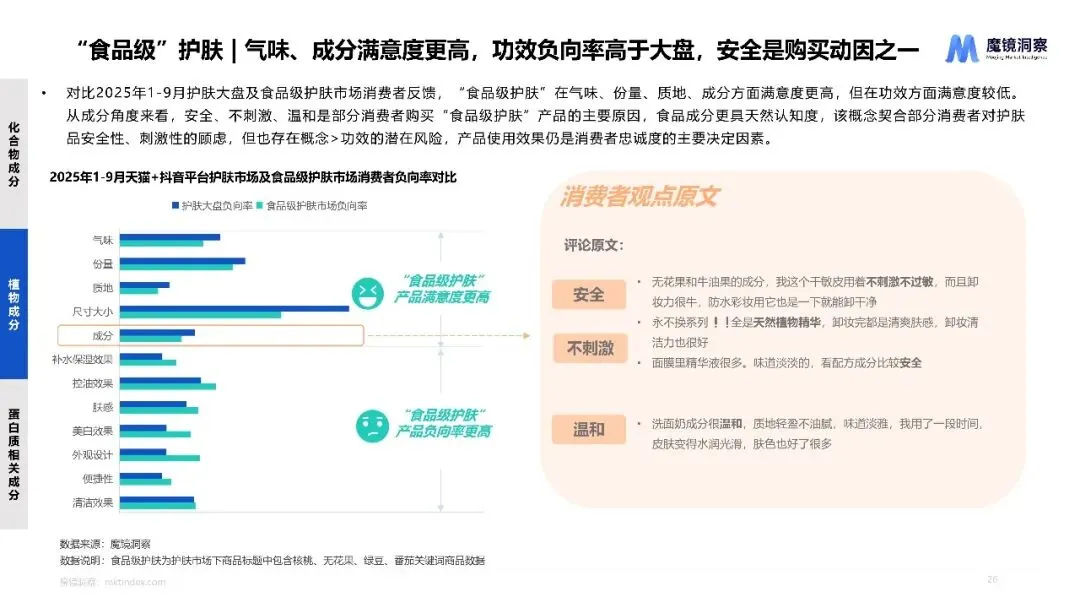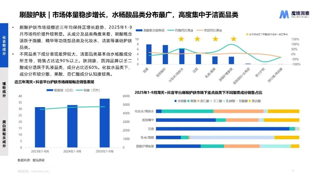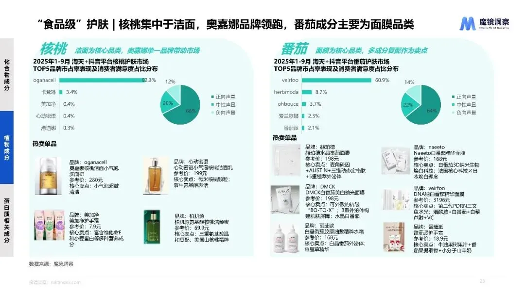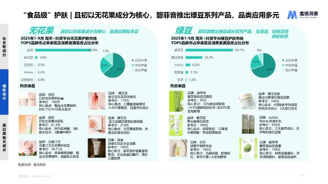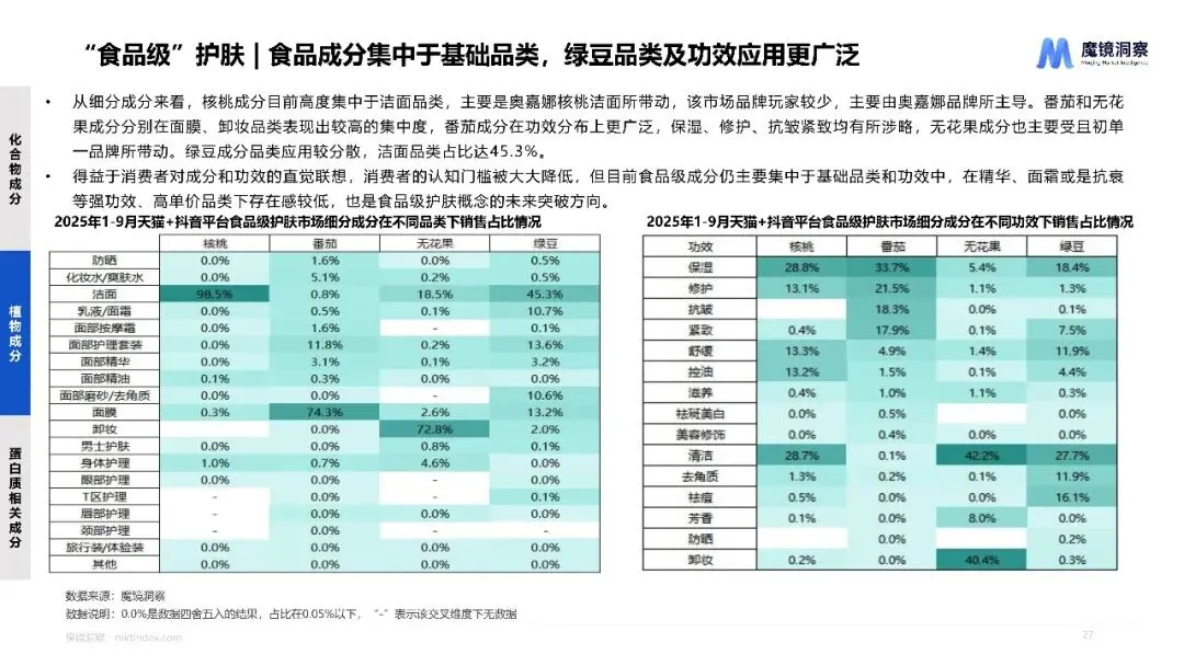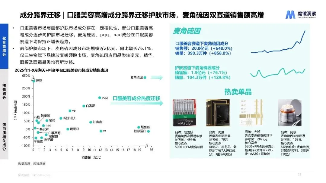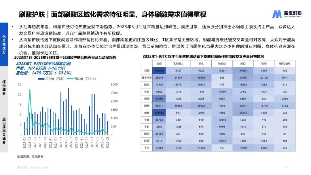 舒缓、修护、抗衰功效翻倍增长,美白门槛提高。刷酸日常化、身体刷酸冒头;口服美容成分麦角硫因、PQQ外迁护肤,食品级“核桃、绿豆”凭安全感走红,东方草本青蒿、山参切入高端修护。精华、面霜成国产高端化主战场,自研环六肽、重组胶原撑起技术故事。