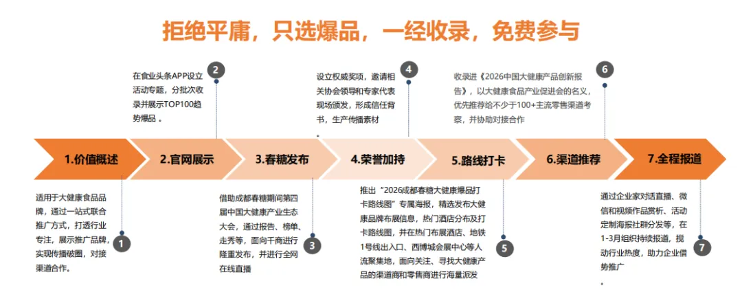 渠道推荐:收录进《2026中国大健康产品创新报告》,以大健康食品产业促进会的名义,优先推荐给不少于100+主流零售渠道考察,并协助对接合作。