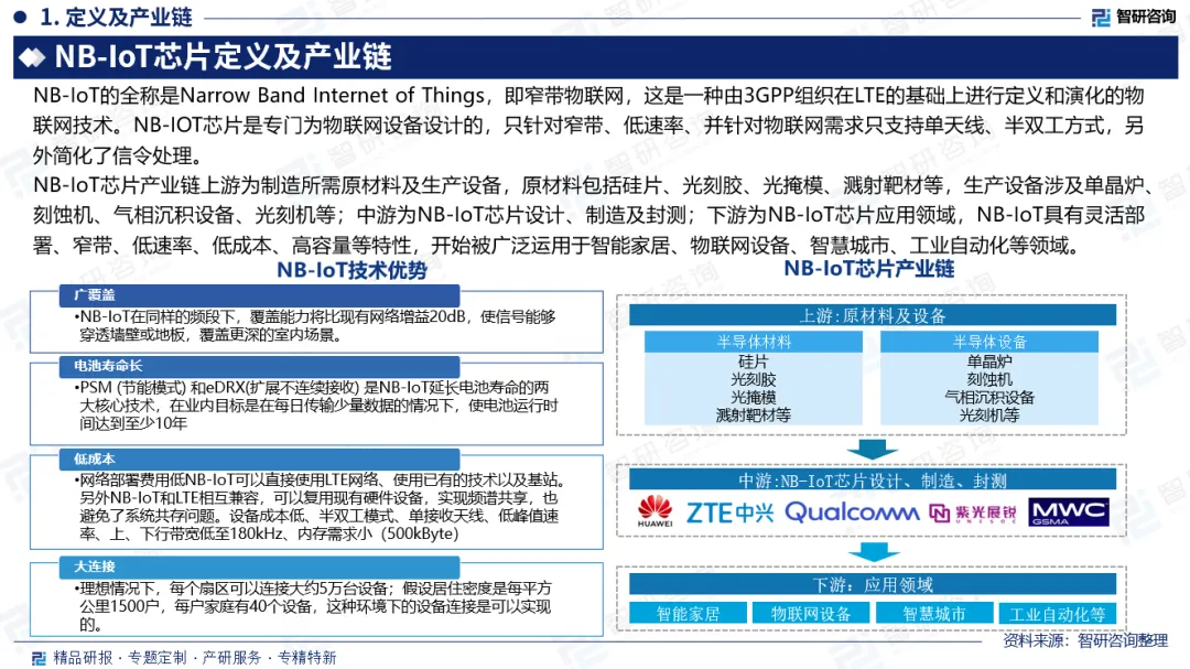 产业链:上游为制造所需原材料及生产设备,原材料包括硅片、光刻胶、光掩模、溅射靶材等,生产设备涉及单晶炉、刻蚀机、气相沉积设备、光刻机等;中游为NB-IoT芯片设计、制造及封测;下游为NB-IoT芯片应用领域,NB-IoT具有灵活部署、窄带、低速率、低成本、高容量等特性,开始被广泛运用于智能家居、物联网设备、智慧城市、工业自动化等领域。