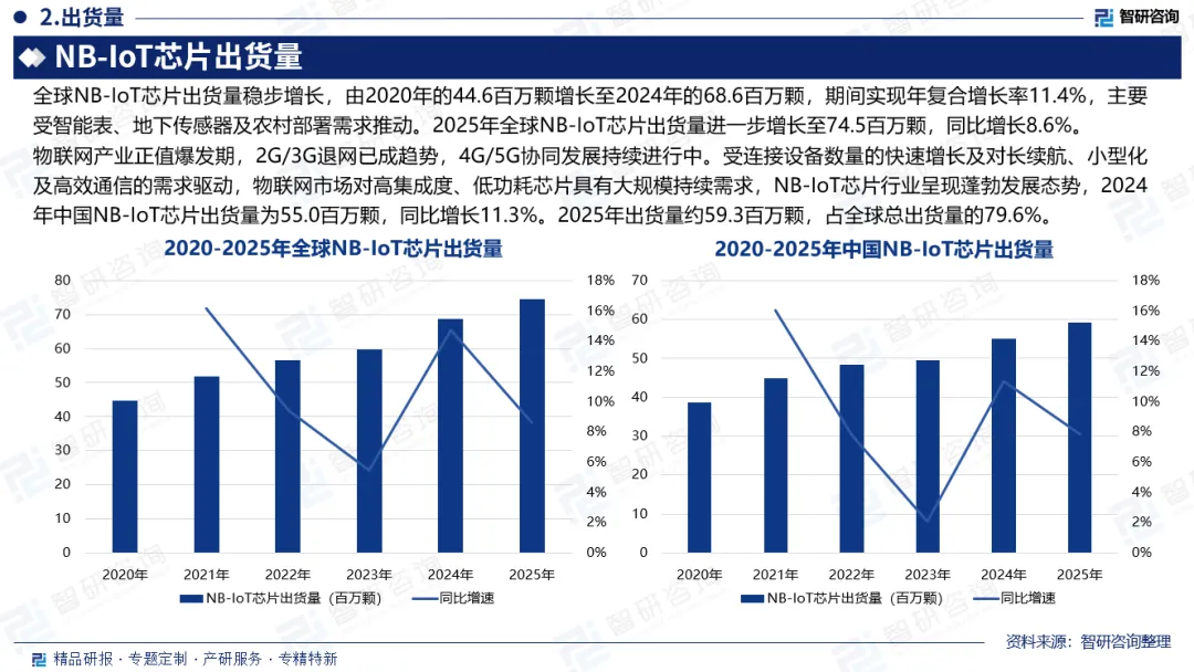 全球出货量:全球NB-IoT芯片出货量稳步增长,由2020年的44.6百万颗增长至2024年的68.6百万颗,期间实现年复合增长率11.4%,主要受智能表、地下传感器及农村部署需求推动。2025年全球NB-IoT芯片出货量进一步增长至74.5百万颗,同比增长8.6%。