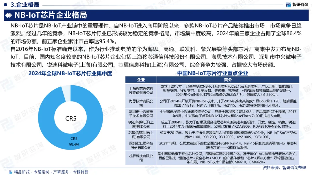 NB-IoT的全称是Narrow Band Internet of Things,即窄带物联网,这是一种由3GPP组织在LTE的基础上进行定义和演化的物联网技术。NB-IOT芯片是专门为物联网设备设计的,只针对窄带、低速率、并针对物联网需求只支持单天线、半双工方式,另外简化了信令处理。全球NB-IoT芯片出货量稳步增长,由2020年的44.6百万颗增长至2024年的68.6百万颗,期间实现年复合增长率11.4%,主要受智能表、地下传感器及农村部署需求推动。2025年全球NB-IoT芯片出货量进一步增长至74.5百万颗,同比增长8.6%。物联网产业正值爆发期,2G/3G退网已成趋势,4G/5G协同发展持续进行中。受连接设备数量的快速增长及对长续航、小型化及高效通信的需求驱动,物联网市场对高集成度、低功耗芯片具有大规模持续需求,NB-IoT芯片行业呈现蓬勃发展态势,2024年中国NB-IoT芯片出货量为55.0百万颗,同比增长11.3%。2025年出货量约59.3百万颗,占全球总出货量的79.6%。NB-IoT芯片是NB-loT产业链中的重要硬件,自NB-IoT进入商用阶段以来,多款NB-IoT芯片产品陆续推出市场,市场竞争日趋激烈。经过几年的竞争,NB-IoT芯片行业已形成较为稳定的竞争格局,市场集中度较高,2024年前三家企业占据了全球86.4%的市场份额,前五家企业累计市占率达95.4%。自2016年NB-IoT标准确定以来,作为行业推动典范的华为海思、高通、联发科、紫光展锐等头部芯片厂商集中发力布局NB-IoT。目前,国内知名度较高的NB-IoT芯片企业包括上海移芯通信科技股份有限公司、海思技术有限公司、深圳市中兴微电子技术有限公司、锐迪科微电子(上海)有限公司、芯翼信息科技(上海)有限公司,综合竞争力较强,占据较大市场份额。