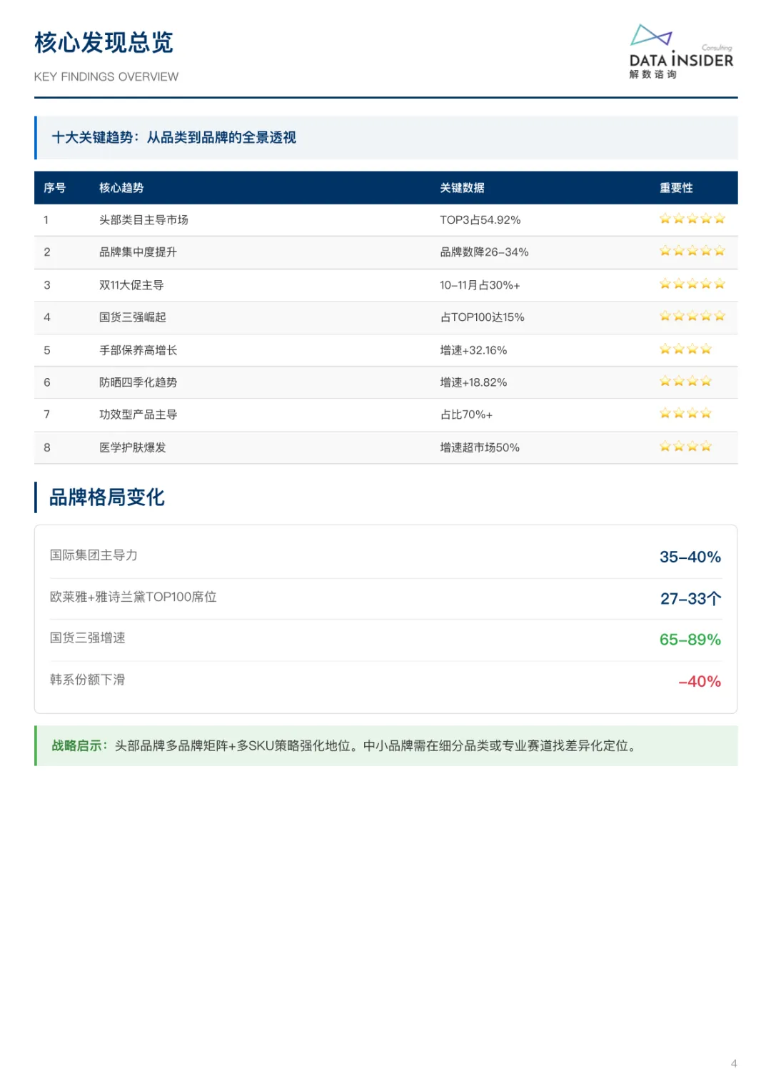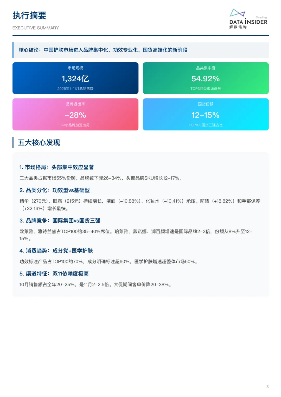 本报告聚焦2024年9月-2025年11月中国护肤品线上零售市场,以1324亿元市场规模、20个核心品类及100强单品为研究样本,系统呈现行业发展态势。数据显示,市场已进入品牌集中化、功效专业化、国货高端化新阶段,头部品类集中度显著,TOP3品类占据54.92%市场份额,品牌数量下降26%-34%的同时,头部品牌SKU持续增长。功效型产品主导市场,成分党与医学护肤需求爆发,防晒、手部保养等品类实现高增长,国货三强增速达国际品牌2-3倍。渠道端呈现双11依赖度极高特征,消费升级与精细化护肤趋势明显。报告为行业参与者提供了品类布局、品牌竞争及消费需求的核心参考。