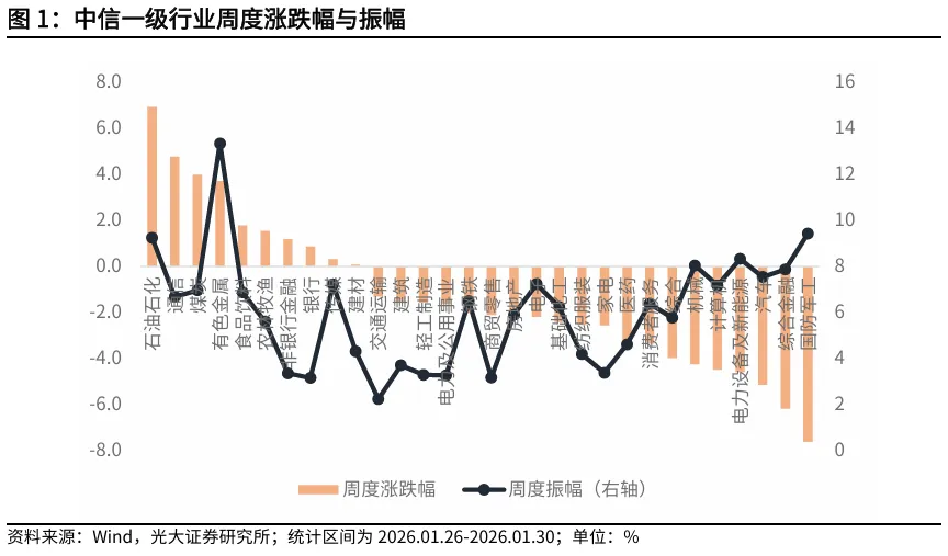 从中信一级行业来看,本周涨跌幅表现最好的前5大行业依次为石油石化、通信、煤炭、有色金属、食品饮料;中信一级行业中振幅最高的前5大行业依次为有色金属、国防军工、石油石化、电力设备及新能源、机械。