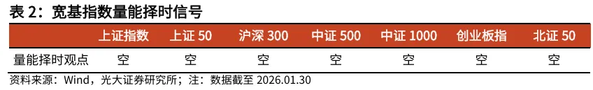 本订阅号中所涉及的证券研究信息由光大证券金融工程研究团队编写,仅面向光大证券专业投资者客户,用作新媒体形势下证券研究信息和观点的沟通交流。非光大证券专业投资者客户,请勿订阅、接收或使用本订阅号中的任何信息。本订阅号无法设置访问权限,任何人成功订阅、接受本订阅号,在任何情况下均不应解释为光大证券同意将其作为任何业务的客户,若因此给您造成不便,敬请谅解。本订阅号推送的任何内容在任何情况下均不作为投资建议,订阅者就基于本订阅号推送内容做出的任何投资决策应当自行承担后果。报告发布日期:2026年1月31日
