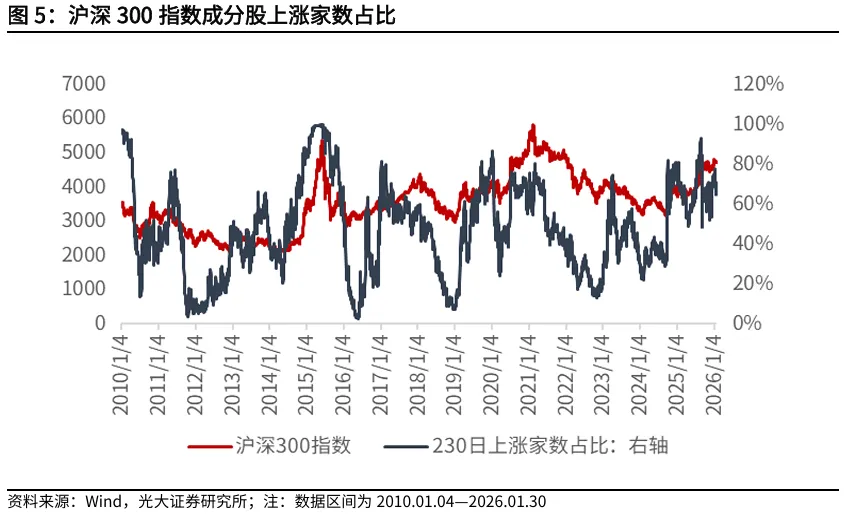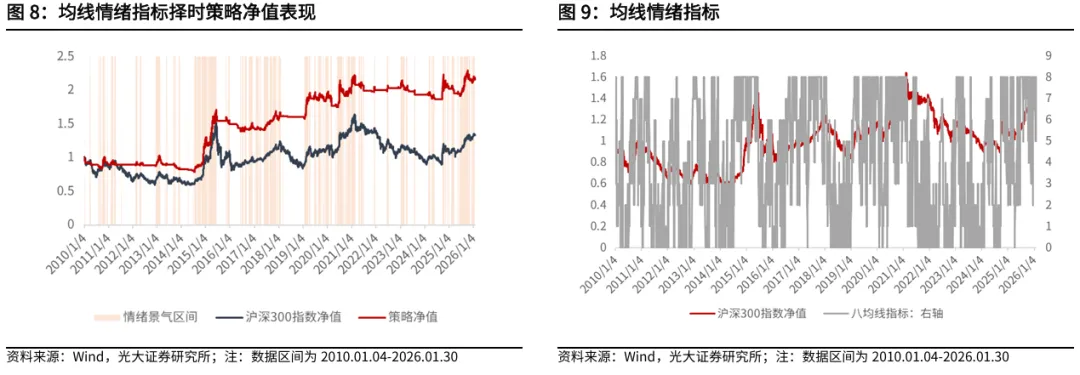 从热点概念来看,本周概念指数中表现最好的前5大概念依次为黄金珠宝指数、光模块(CPO)指数、光通信指数、油气开采指数、生物育种指数;表现最差的5大概念依次为卫星互联网指数、锂电电解液指数、商业航天指数、卫星导航指数、军工信息化指数。截至2026年1月30日,宽基指数来看,中证500、中证1000、创业板指处于估值分位数“适中”等级,上证指数、上证50、沪深300处于估值分位数“危险”等级。中信一级行业分类来看,食品饮料、非银行金融处于估值分位数“安全”等级。从量能择时信号来看,截至1月30日,各指数量能择时信号均为谨慎观点。强势股往往具备较强的示范效应,当市场情绪处于乐观状态时,强势股的持续上行能为整个板块带来机会。我们可以通过计算指数成分股的近期正收益的个数来判断市场情绪。当市场中正收益的股票逐步增多时,往往处于行情的底部。同理,当大部分股票都处于正收益状态,情绪可能已经过热,未来有下跌风险。沪深300指数N日上涨家数占比 = 沪深300指数成分股过去N日收益大于0的个股数占比。我们发现,该指标可以较快捕捉上涨机会;同时,由于选择在市场过热阶段提前止盈离场,也会错失市场持续亢奋阶段的上涨收益。指标在对下跌市场的判断也存在缺陷,难以有效规避下跌风险。截至2026年1月30日,该指标环比前一周下降,上涨家数占比指标高于60%,市场情绪较高。我们通过对指标进行两次不同窗口期的平滑来捕捉指标变动情况,当短期平滑线大于长期平滑线时,说明指标正在上行,看多市场。当短期平滑线小于长期平滑线时,说明市场情绪正在拐头向下,对市场持中性态度。(1)沪深300指数N日上涨家数占比并进行窗口期为N1和N2的移动平均,分别称之为慢线和快线,其中N1>N2。截至2026年1月30日,从动量情绪指标走势来看,快线慢线均上行,目前快线处于慢线上方,预计在未来一段时间内将维持看多观点。我们在报告《司空见惯叙指标——技术形态选股系列报告之五》中讨论过八均线体系的使用方式——以指标区间对标的指数的趋势状态进行判断。我们将八均线区间值处于1/2/3 时对八均线指标值赋值为-1,八均线区间值处于4/5/6 时对八均线指标值赋值为0,八均线区间值处于7/8/9 时对八均线指标值赋值为1。通过这种划分,指标值状态与HS300 的涨跌变化规律更加清晰。