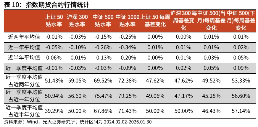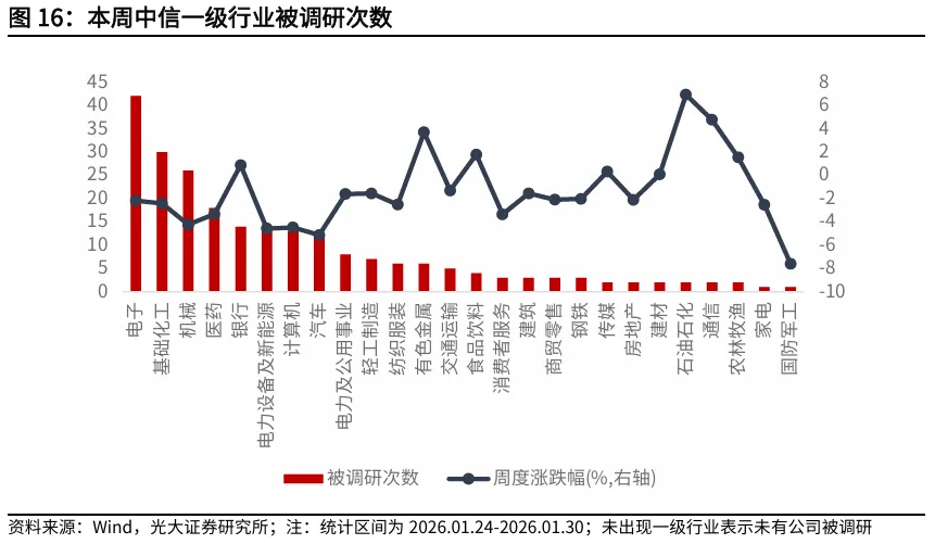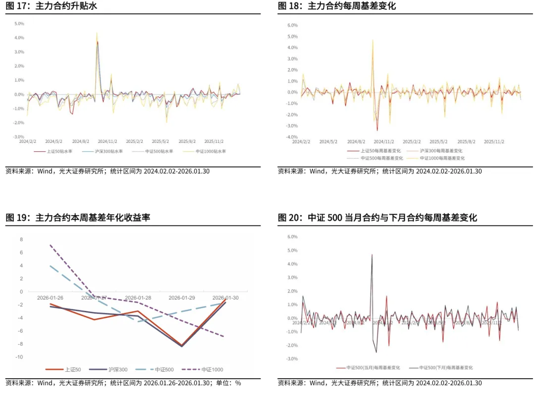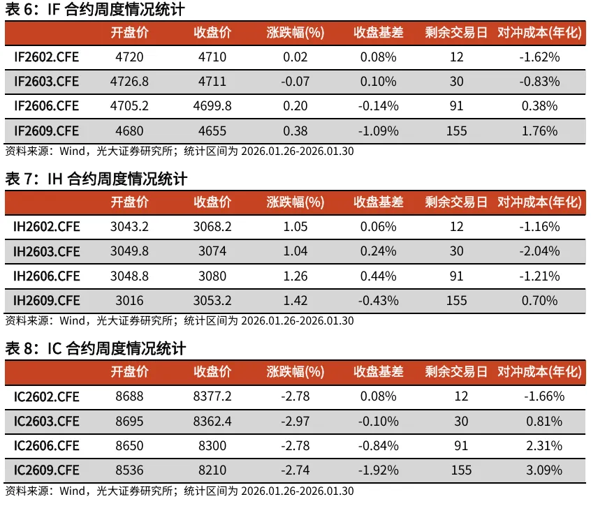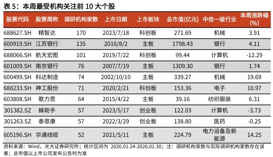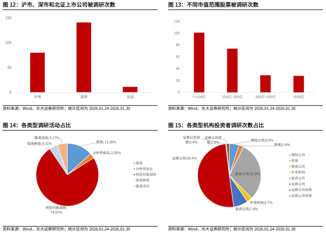 本周(2026.01.24-2026.01.30,下同),机构调研活动累计232场。从三地上市公司被调研次数来看,沪市上市公司累计被调研80次,深市上市公司累计被调研141次,北证上市公司累计被调研11次。从被调研股票市值来看,市值小于等于100亿、100亿至200亿、200亿至500亿以及大于500亿的上市公司累计被调研101次、74次、29次和28次。从调研类型来看,特定对象调研和其他为本周主要调研类型,占比分别为74.57%和13.36%。从机构类型来看,投资公司、基金公司和证券公司的调研次数占比依次为7.4%、30.3%和50.4%。从中信一级行业来看,本周电子、基础化工和机械行业被调研次数较多,本周涨跌幅依次为-2.18%、-2.40%和-4.23%。从个股来看,本周受到机构关注程度最高的前5大个股依次为精智达(170家)、江苏银行(135家)、航天宏图(101家)、南京银行(76家)和科达制造(74家)。本周IF当月合约上涨0.02%,收于4710,收盘基差0.08%;IH当月合约上涨1.05%,收于3068.2,收盘基差0.06%;IC当月合约下跌2.78%,收于8377.2,收盘基差0.08%;IM当月合约下跌2.44 %,收于8282.4,收盘基差0.33%。本周除上证50和沪深300外,其余指数期货主力合约贴水率环比前一交易周下降。IF当月合约近一季度平均每周基差变化0.02%,相比于近半年的0.01%环境变好。IH当月合约近一季度平均每周基差变化0.00%,相比于近半年的0.00%环境不变。IC当月合约近一季度平均每周基差变化0.05%,相比于近半年的0.03%环境变好。本周港股通交易区间为2026年1月26日-2026年1月30日,南向资金净流入27.08亿港元,其中沪市港股通净流出19.21亿港元,深市港股通净流入46.29亿港元。