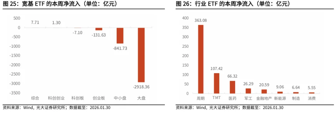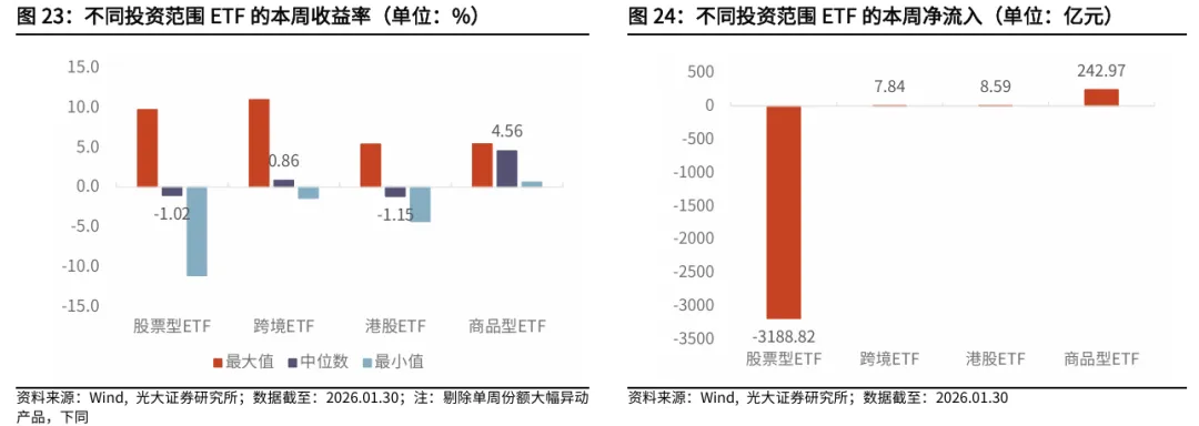 截至2026年1月29日,融资余额为27222.32亿元,较2026年1月23日(27061.41亿元)融资增加额为160.91亿元。股票型ETF本周收益中位数为-1.02%,资金净流出3188.82亿元。跨境ETF本周收益中位数为0.86%,资金净流入7.84亿元。港股ETF本周收益中位数为-1.15%,资金净流入8.59亿元。商品型ETF本周收益中位数为4.56%,资金净流入242.97亿元。宽基ETF方面,本周综合主题ETF资金净流入居前,合计流入7.71亿元。行业ETF方面,本周周期主题ETF资金净流入明显,合计流入363.08亿元。