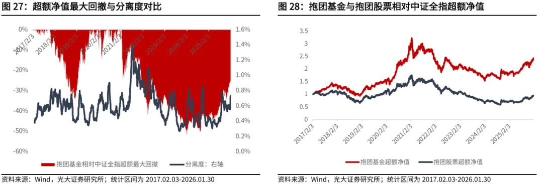 构造抱团基金组合可以帮助我们实时监控基金抱团程度。具体来说,我们通过分离度指标作为基金抱团程度的代理变量。具体计算方式为抱团基金截面收益的标准差,如果抱团基金组合的截面收益标准差小,说明抱团基金表现趋同,抱团程度高,反之表示抱团正在瓦解。截至2026年1月30日,基金抱团分离度环比前一周小幅上行。最近一周抱团股超额收益环比前一周下跌,抱团基金超额收益环比前一周上升。风险提示:报告结果均基于历史数据,历史数据存在不被重复验证的可能。详见2026年1月31日发布的《市场交易情绪回落——金融工程市场跟踪周报20260131》