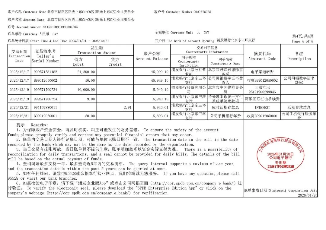 2.年末结余5,893.01元,将结转下年度用于小区公共事务;