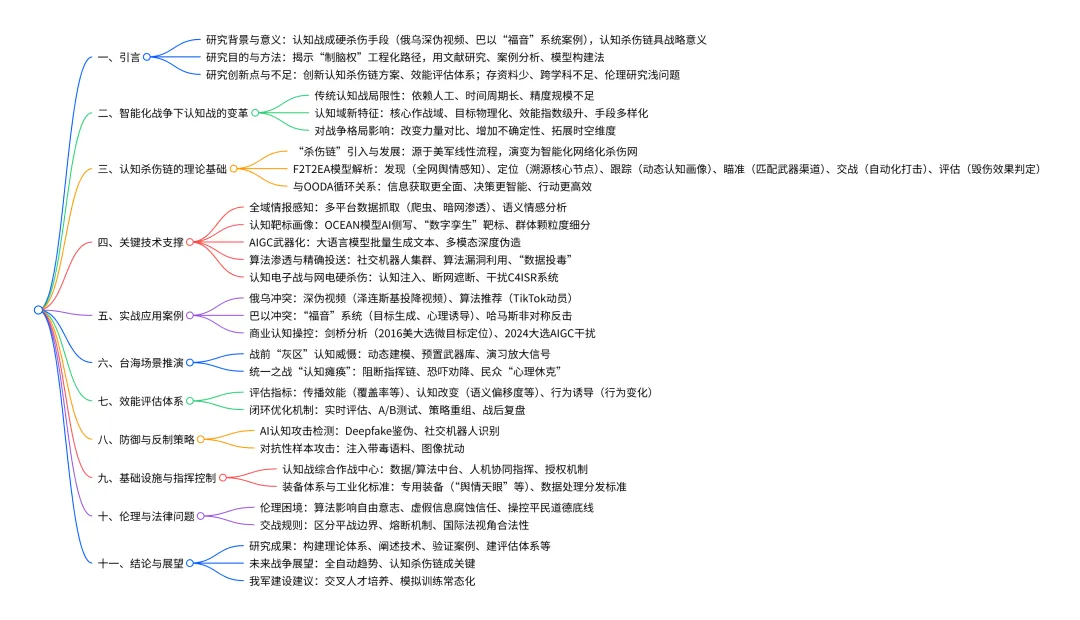 构建认知杀伤链理论体系,阐述关键技术,验证实战案例,建立评估体系,提出防御反制策略,探讨伦理法律问题。 - 对未来战争形态的展望