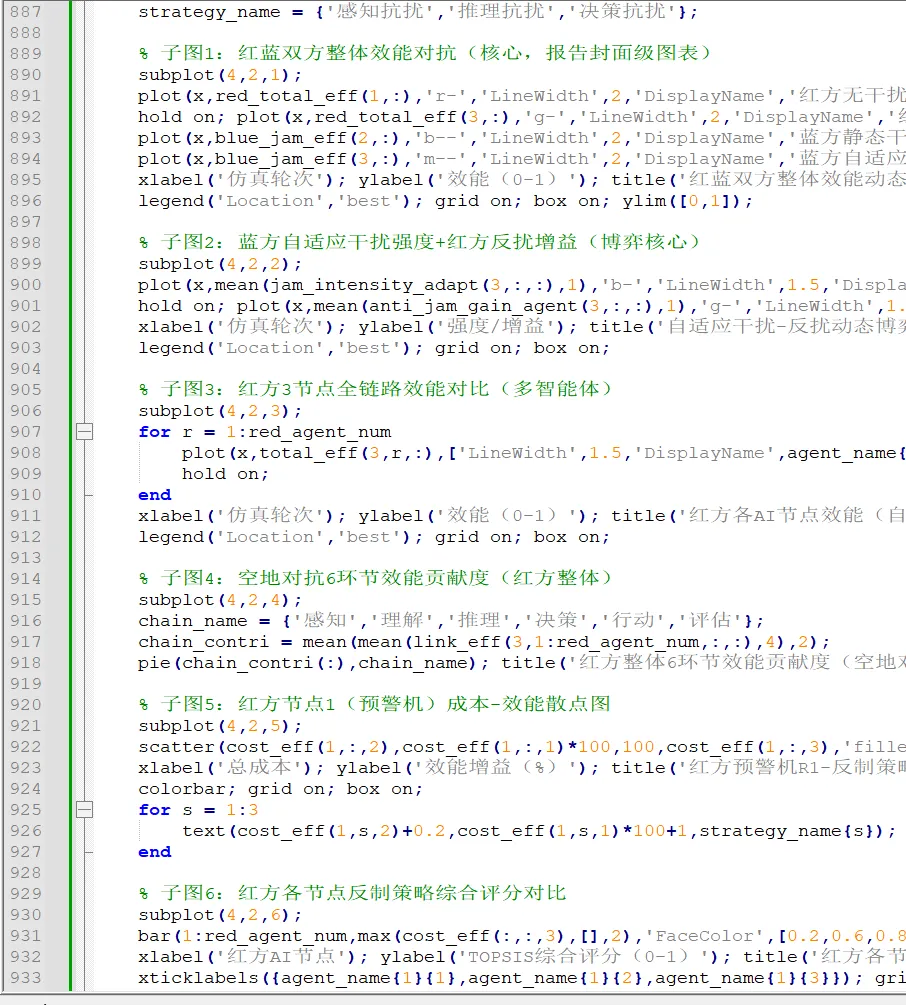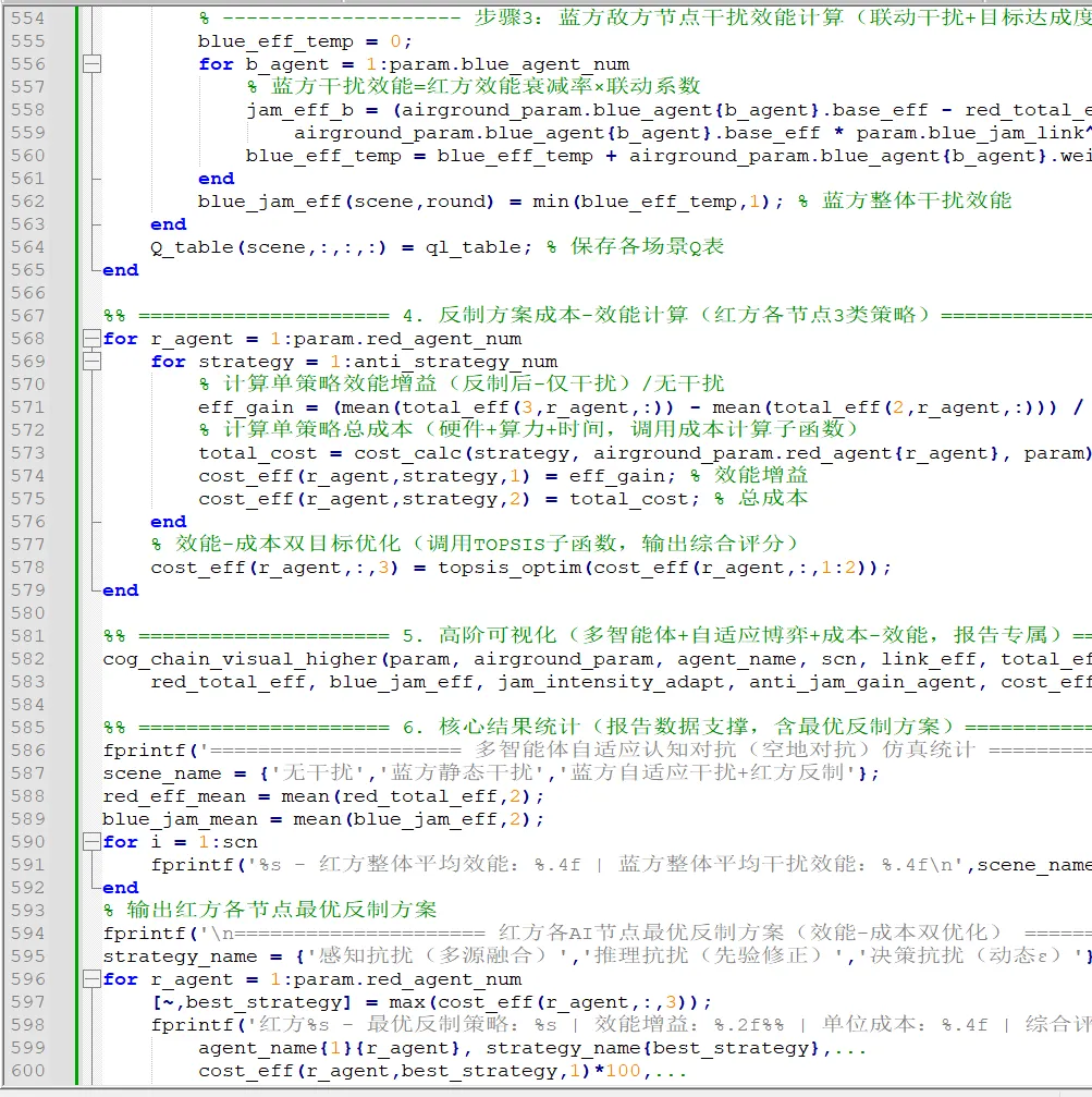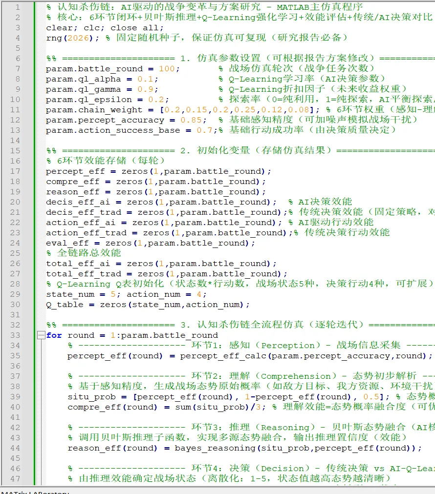 代码分为主程序和4 个功能子函数,主程序调用子函数实现全流程仿真,子函数分别负责:贝叶斯态势推理、Q-Learning 智能决策、环节效能计算、结果可视化,结构清晰且便于报告中的方案修改与对比。