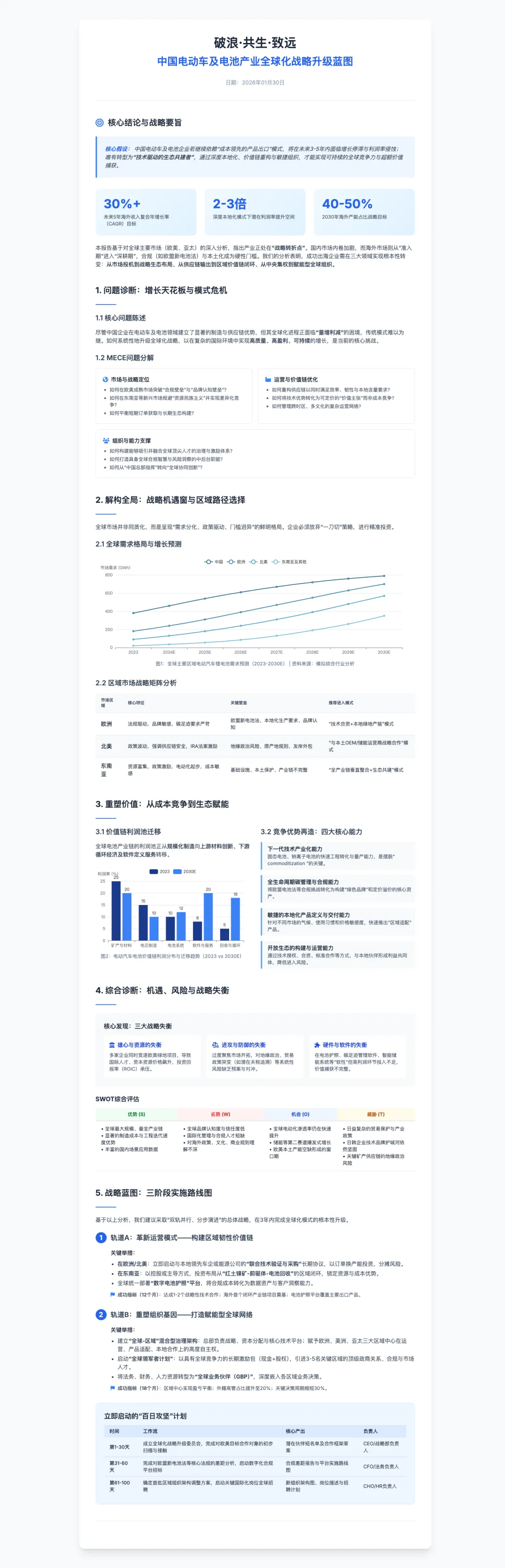 • 第一年(筑基年):重点完成1-2个海外样板工厂的投产与合规认证;建立全球财务与供应链数字化管理雏形;启动核心市场本地团队建设。 • 第二年(拓展年):在重点区域实现销售放量;推出针对本地需求的差异化产品;完成主要市场的“电池护照”等合规接入。 • 第三年(融合年):海外业务贡献显著利润份额;与至少一个国际主流车企或能源集团达成深度战略合作;在下一代电池技术产业化上取得里程碑式进展。