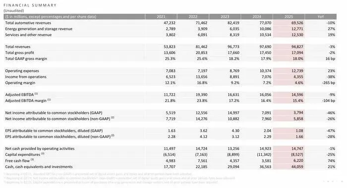2025年,特斯拉的营收和利润均出现下滑。财报显示,特斯拉2025年总营收为948.27亿美元,同比下降3%;归属于普通股股东的净利润为37.94亿美元,同比下降46%。其中,汽车业务收入为 695.26亿美元,同比下降10%,毛利率为17.8%。